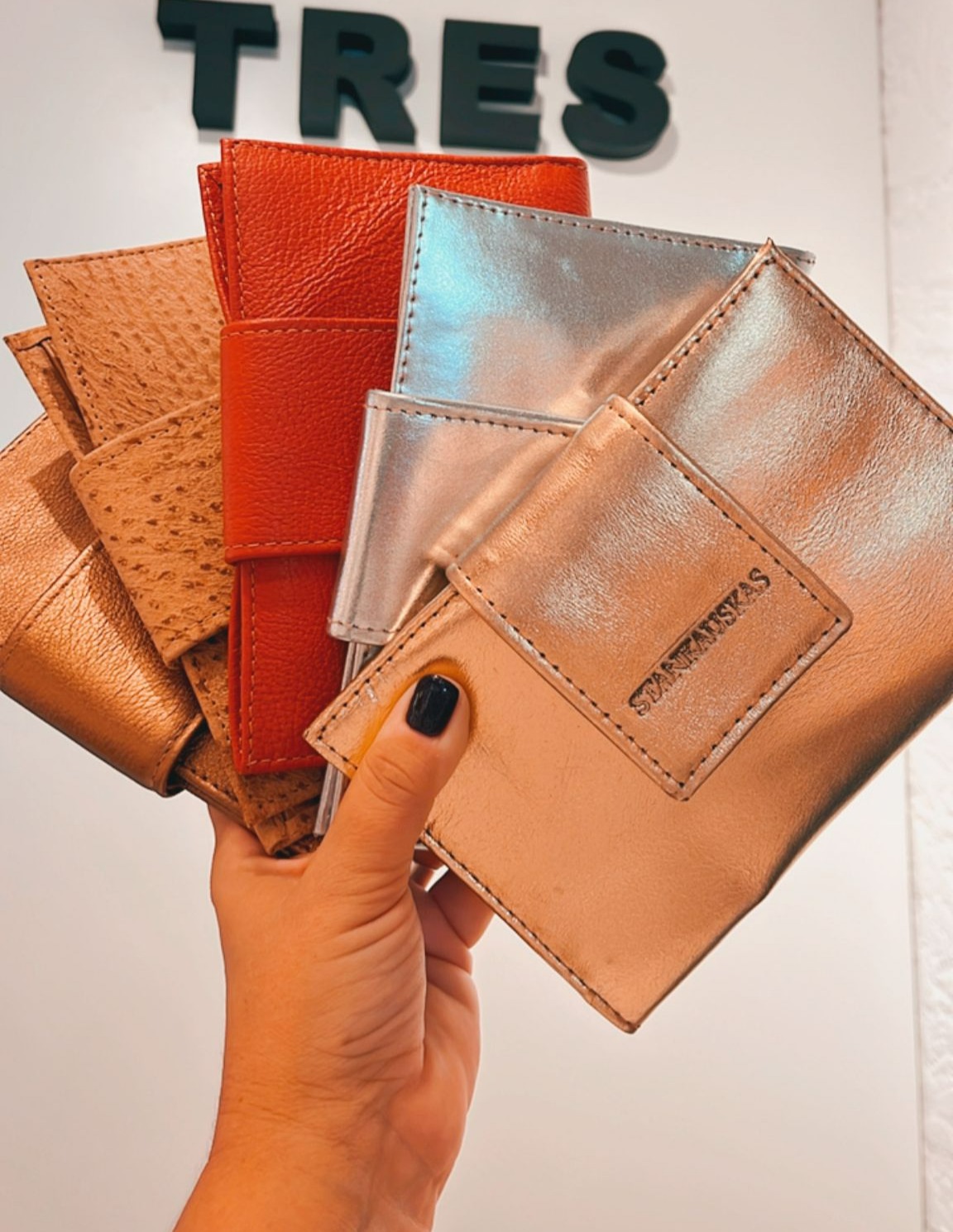Billetera de cuero, con interior de cuero, con espacio para billetes, para fotos y para tarjetas. Ademas incluye un portadocumentos con cierre para poner monedas que se puede usar por separado o dentro de la billetera.