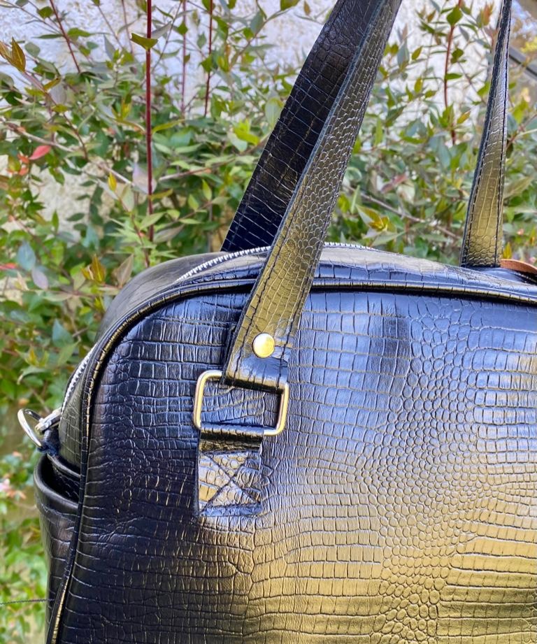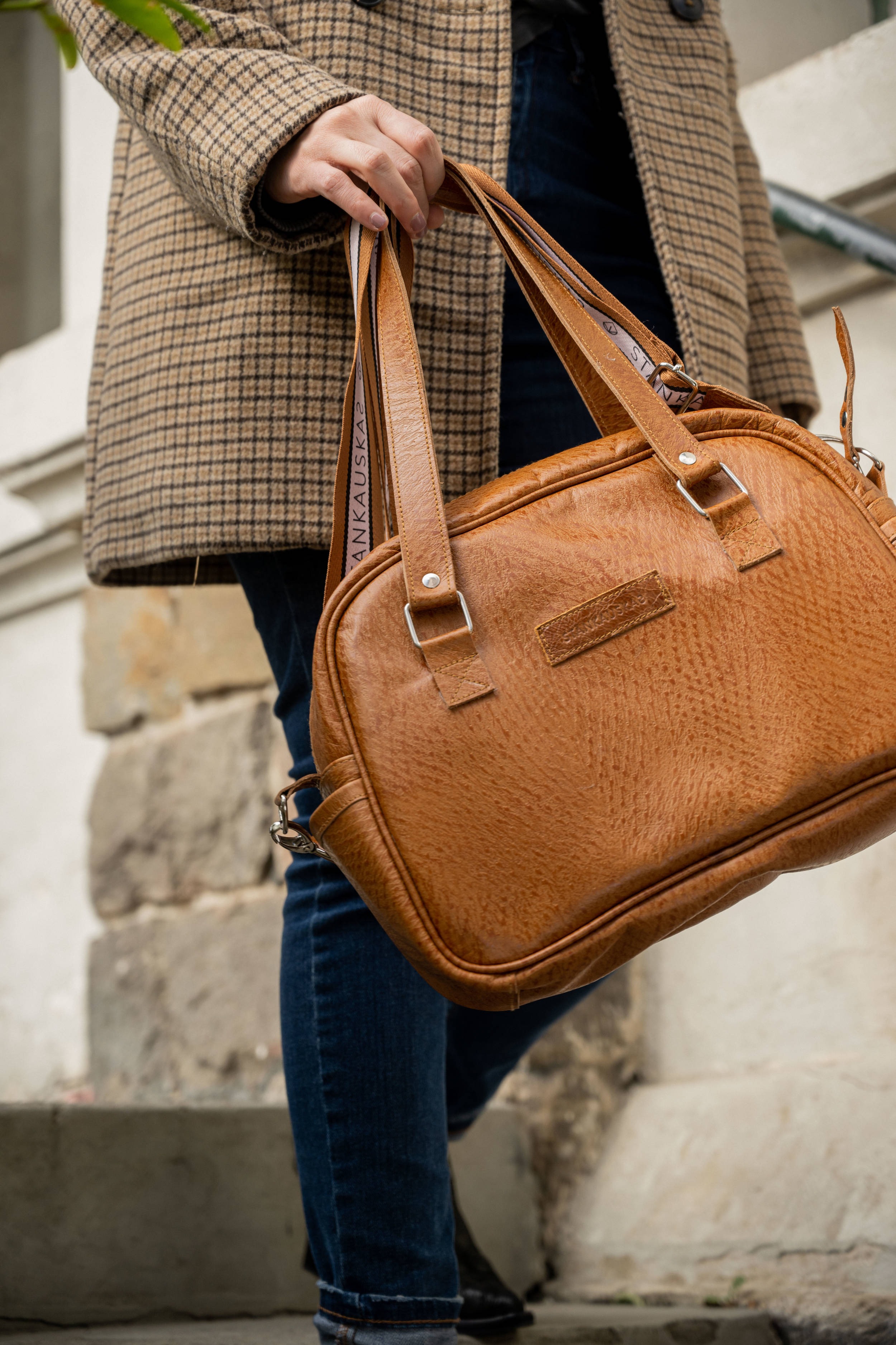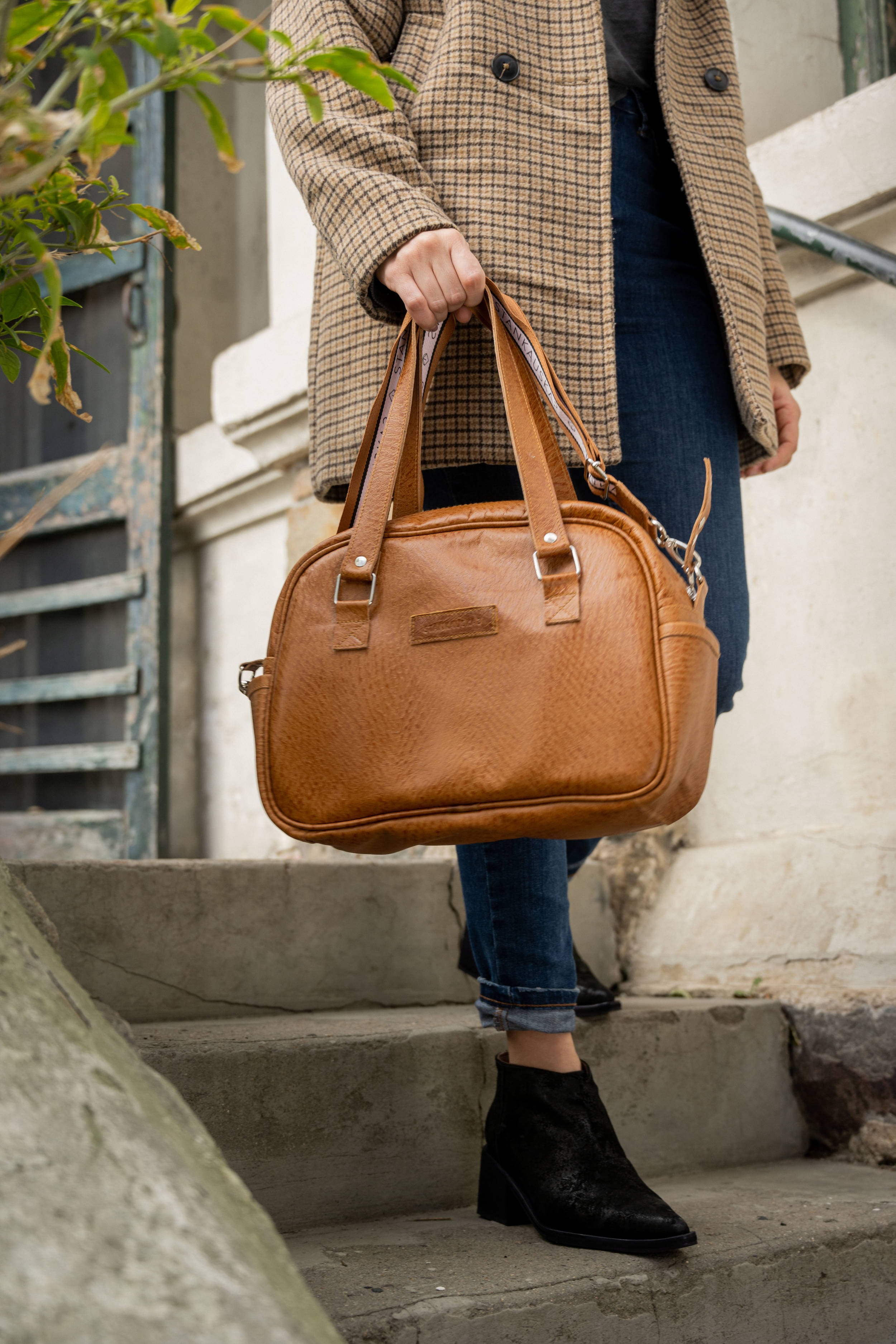 Bolso - cartera de cuero. Manijas cortas de cuero y asa larga regulable de cinta. Interior forrado con bolsillo con cierre. Bolsillos en los laterales. Medidas 32 cm de base x 24 cm de alto x 12 cm de profundidad. (el diseño de la correa larga puede variar según disponibilidad)