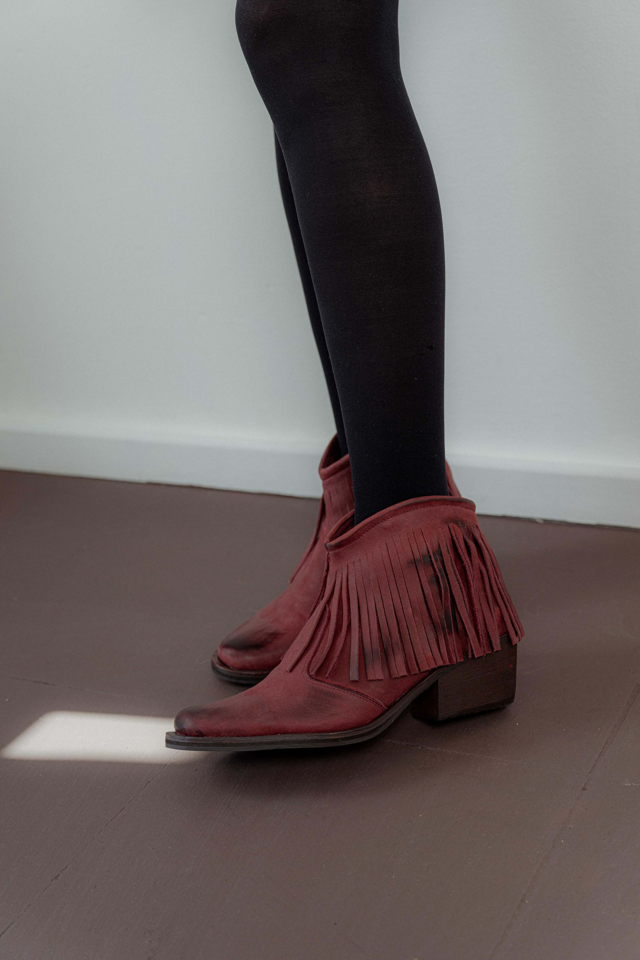 Botin de cuero con detalle de flecos, 100% de cuero Con cierre lateral, Interior forrado de cuero, con plantilla de cuero acolchada Con suela de goma antideslizante y taco de madera de 4 cm.