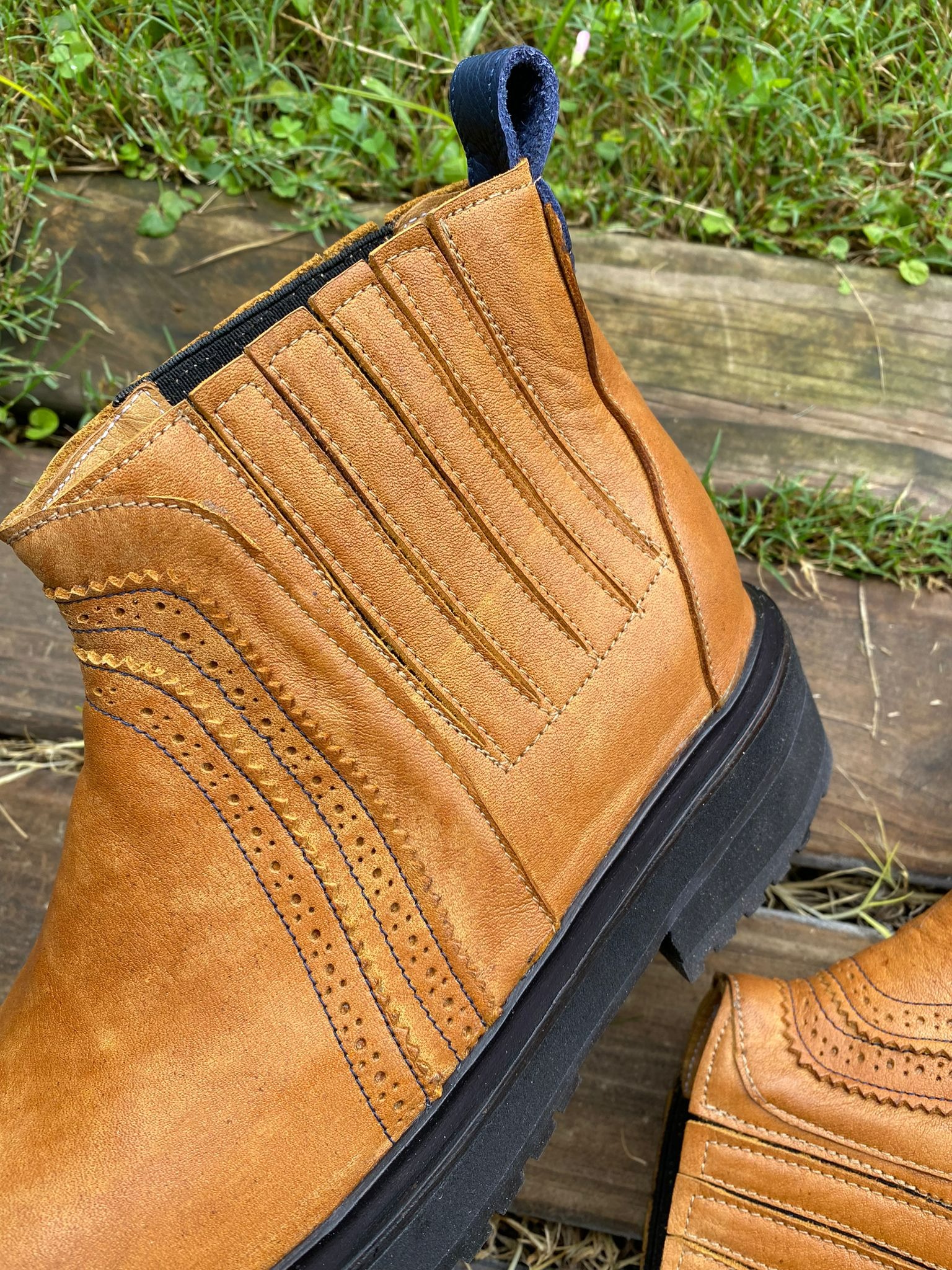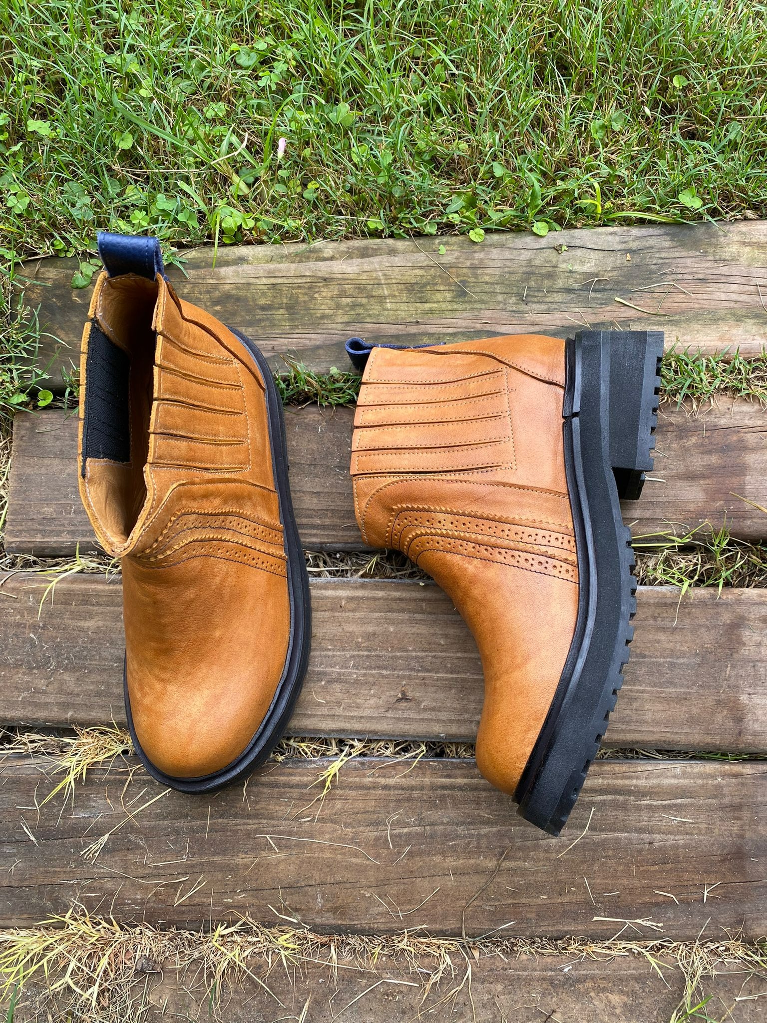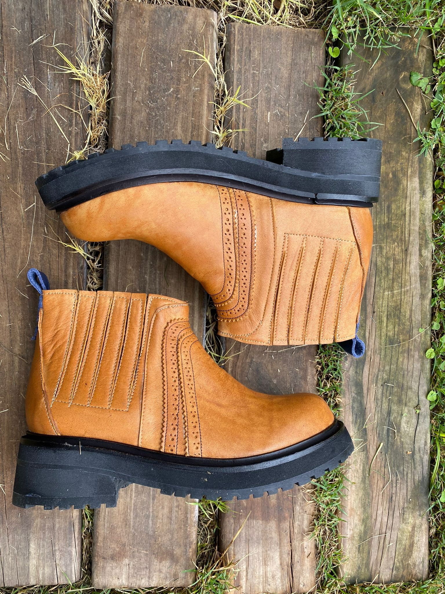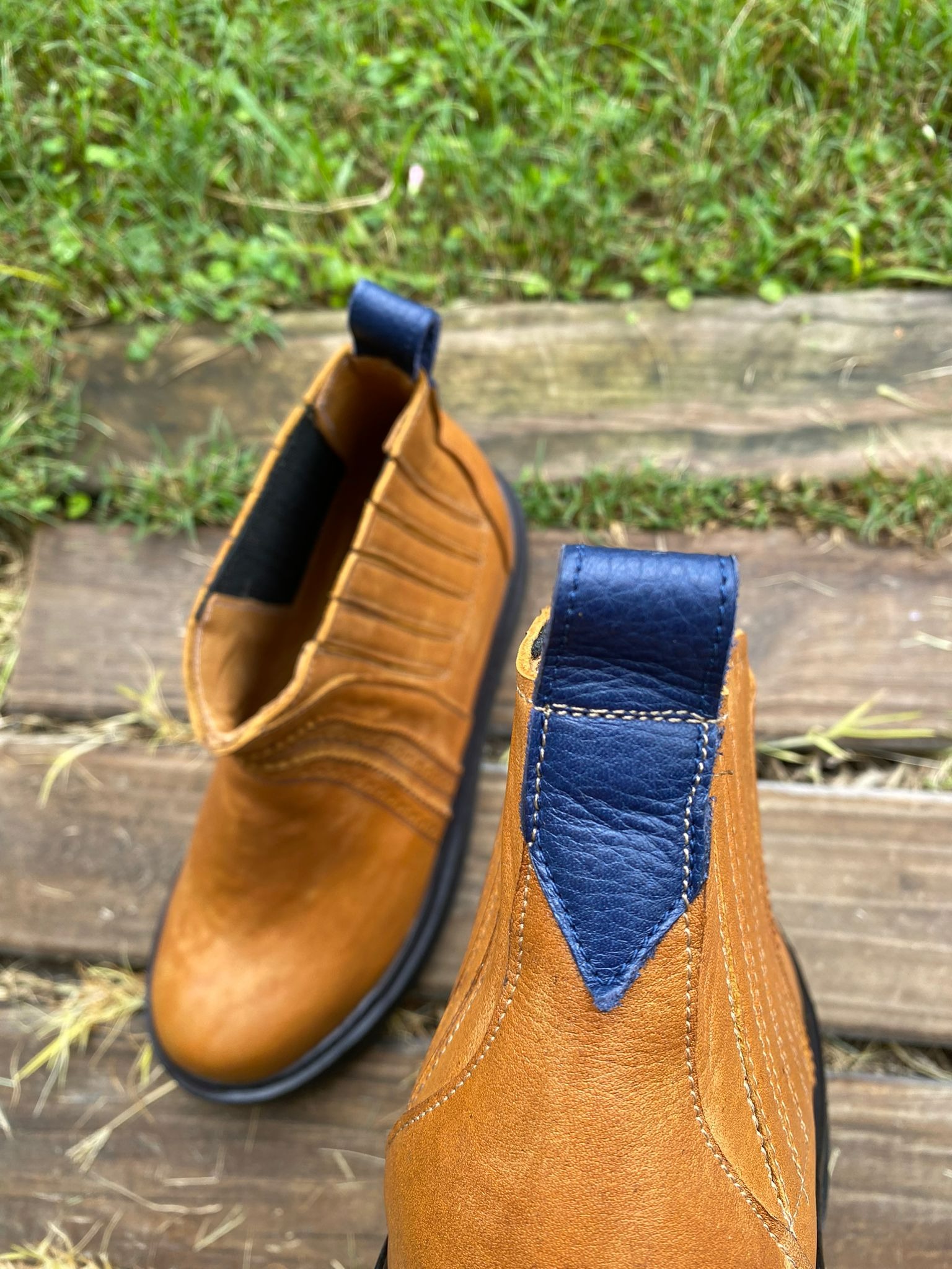 Bota de cuero con efecto desgastado, con costuras y talon en azul. Calado superior. Interior forrado 100% de cuero con plantilla acolchonada. Suela de goma negra con taco de 3 cm.