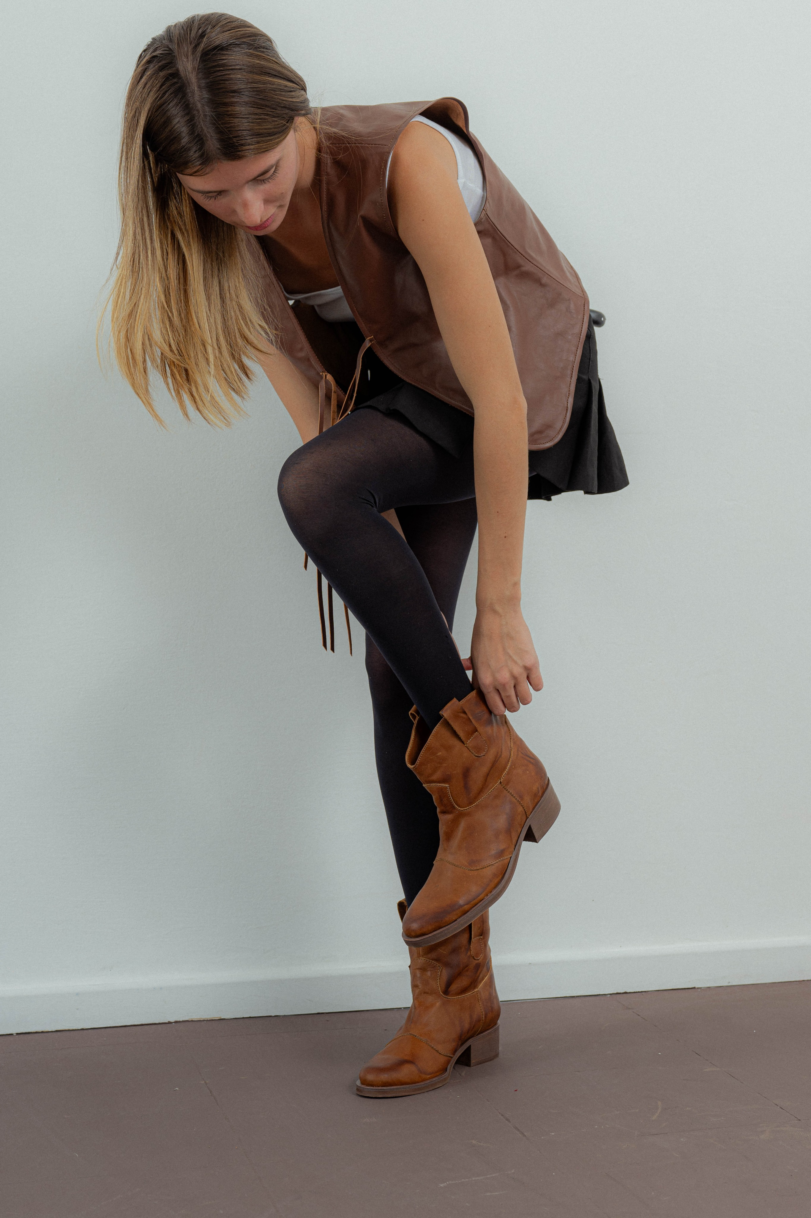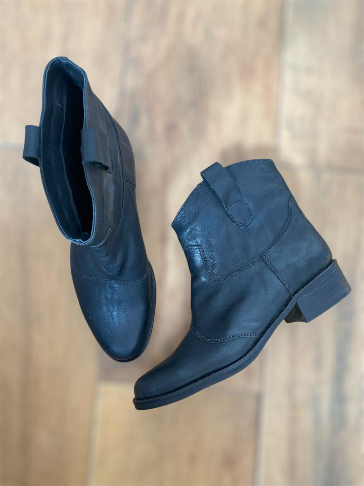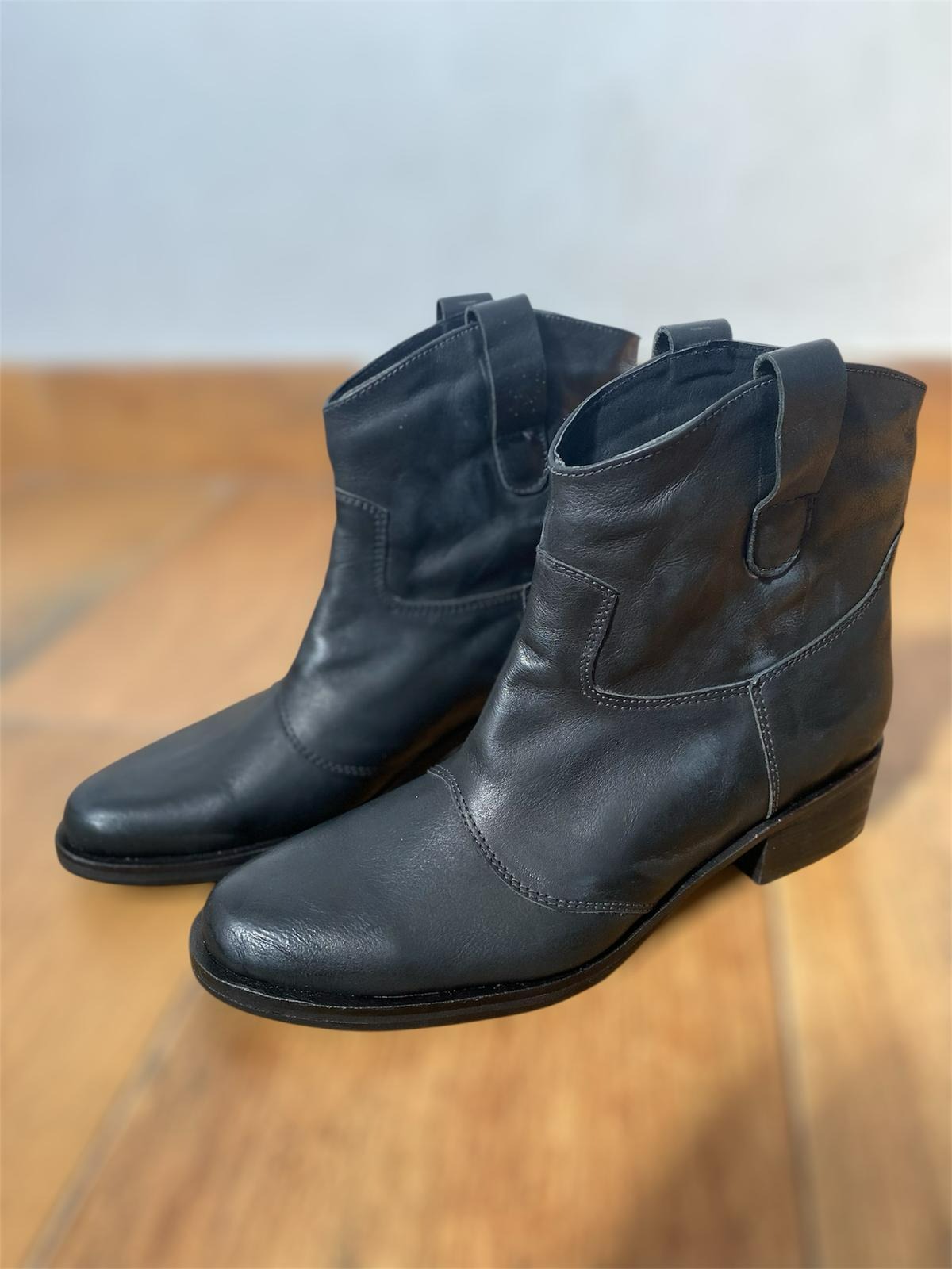 Bota corta de cuero. Basica con un calce super comodo que no necesita cierre para ponerla. Interior con plantilla de cuero acolchada. Taco de madera de 3,5 cm, suela de goma antideslizante.