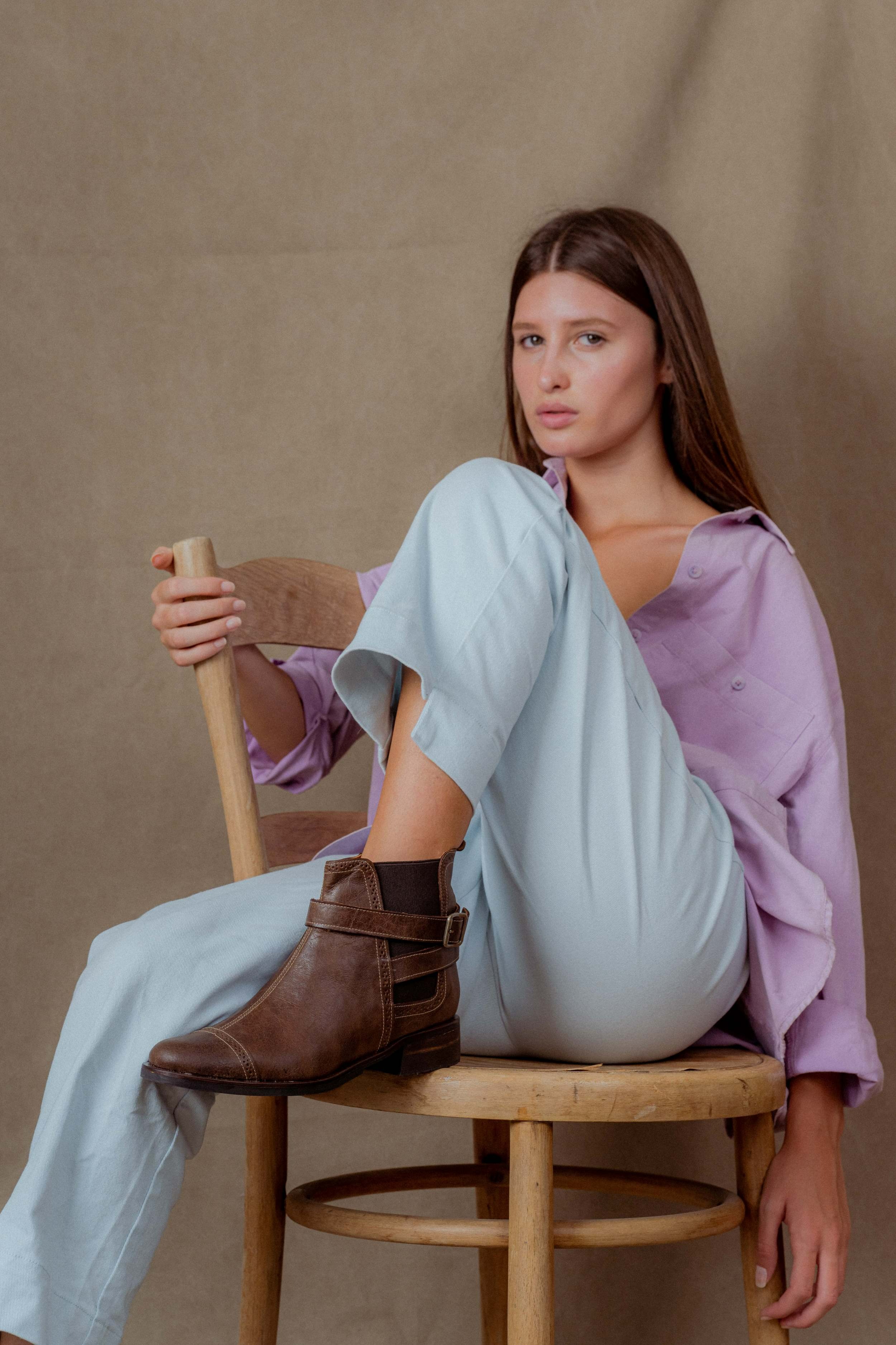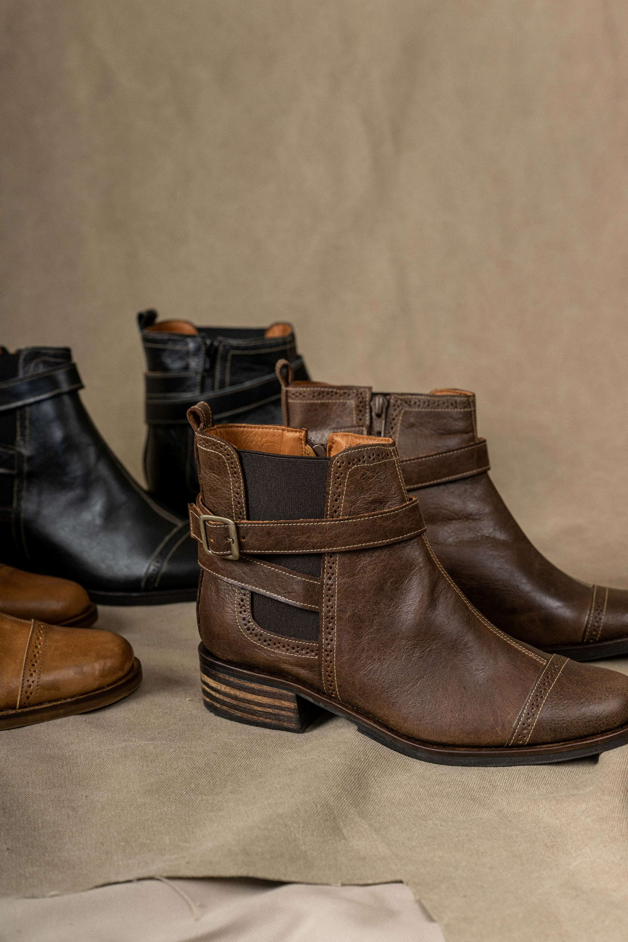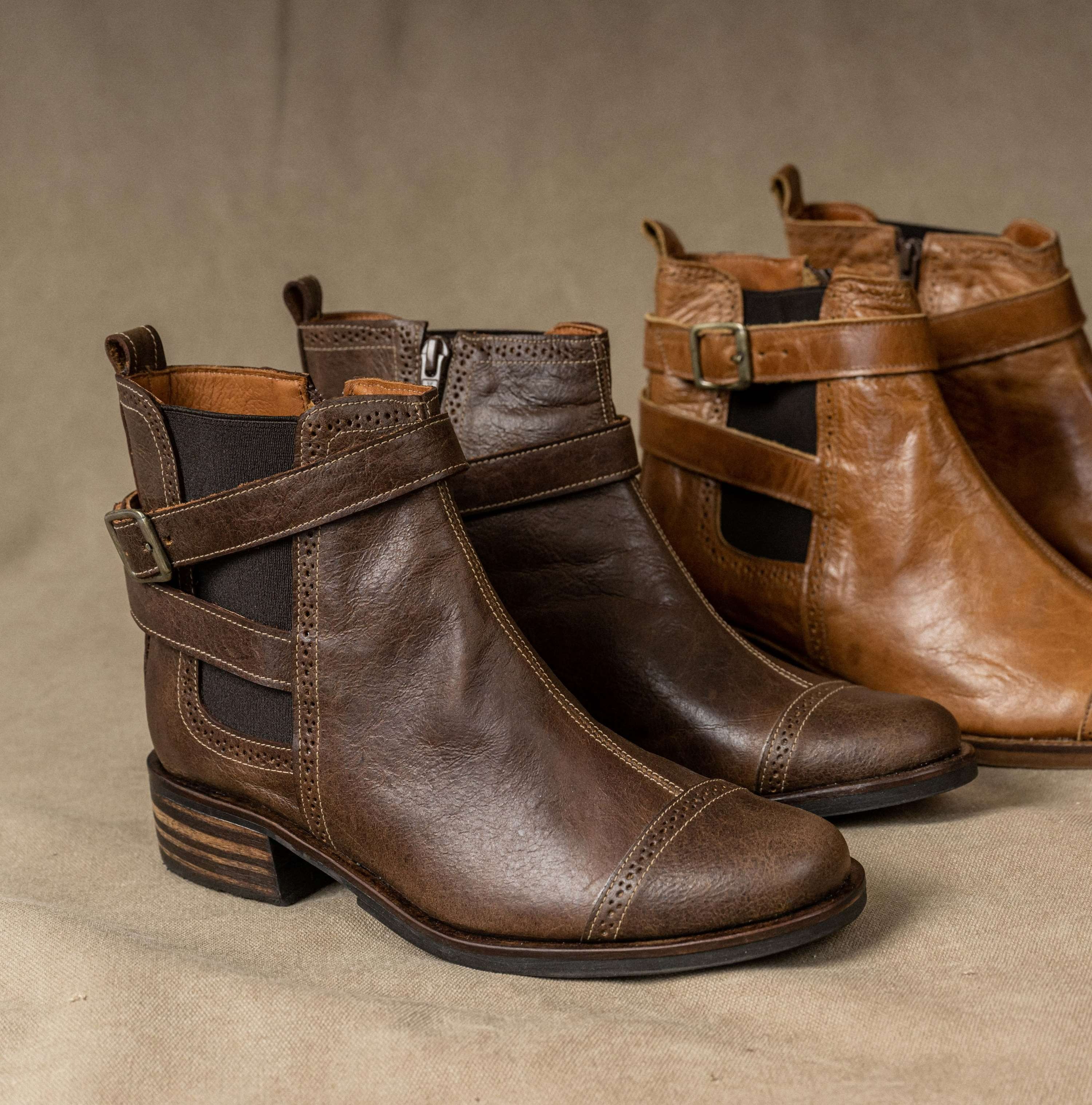Bota de cuero con elastico lateral y hebillas decorativas. Con nuestra ya conocida horma super cómoda, ahora con un nuevo modelo. Forrada 100% de cuero en su interior, con plantilla acolchonada, y con suela de goma antideslizante. Con calado superior y elástico lateral para mayor comodidad. Taco de madera pintado de 3 cm.