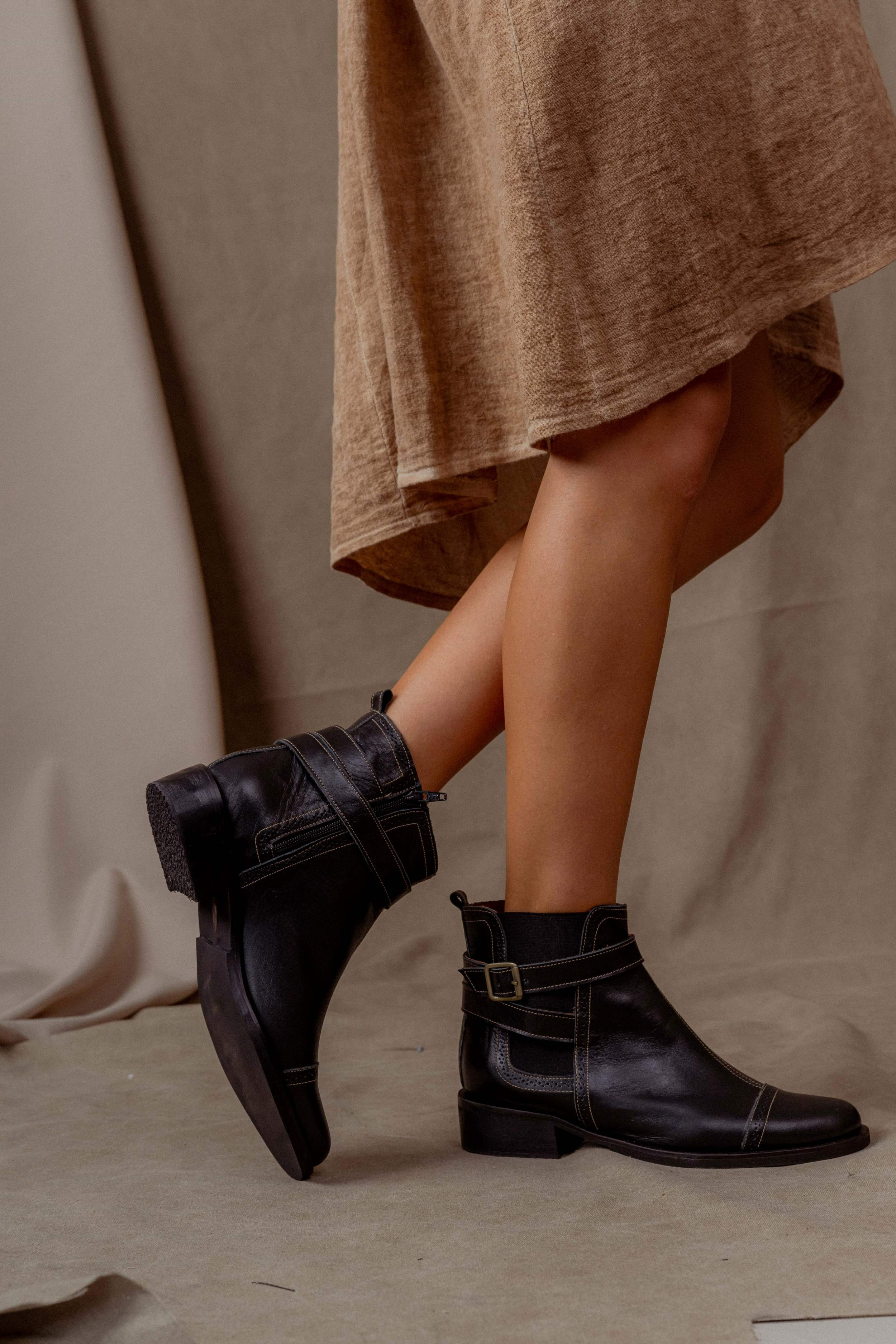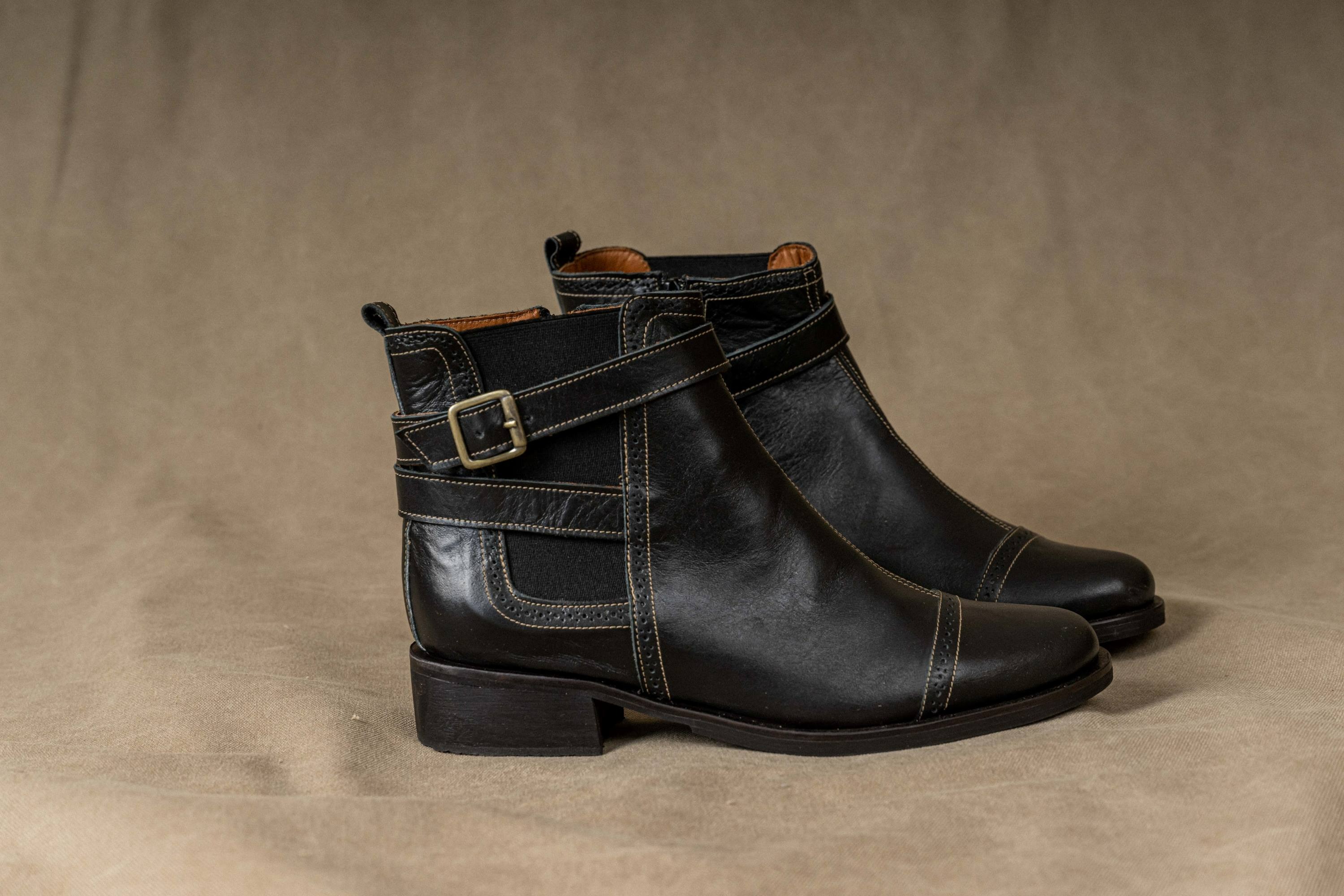 Bota de cuero con elastico lateral y hebillas decorativas. Con nuestra ya conocida horma super cómoda, ahora con un nuevo modelo. Forrada 100% de cuero en su interior, con plantilla acolchonada, y con suela de goma antideslizante. Con calado superior y elástico lateral para mayor comodidad. Taco de madera pintado de 3 cm.