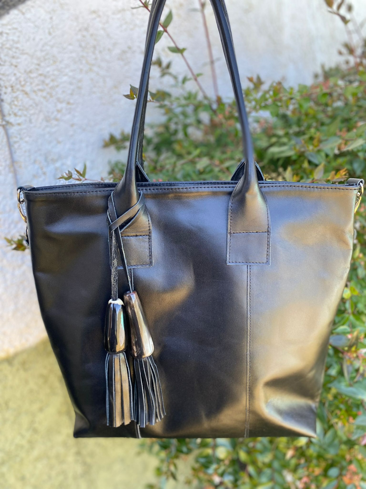 Cartera de cuero liviana y cómoda, con cierre superior. Forrado interior de algodon con bolsillo con cierre. Correa larga desmontable y ajustable. Dos asas cortas para usarlo como bolso o cruzado. Detalles de campanas de guampas con borlas desmontable. MEdidas 35 cm de base x 37 cm de alto x 10 cm de profundidad.