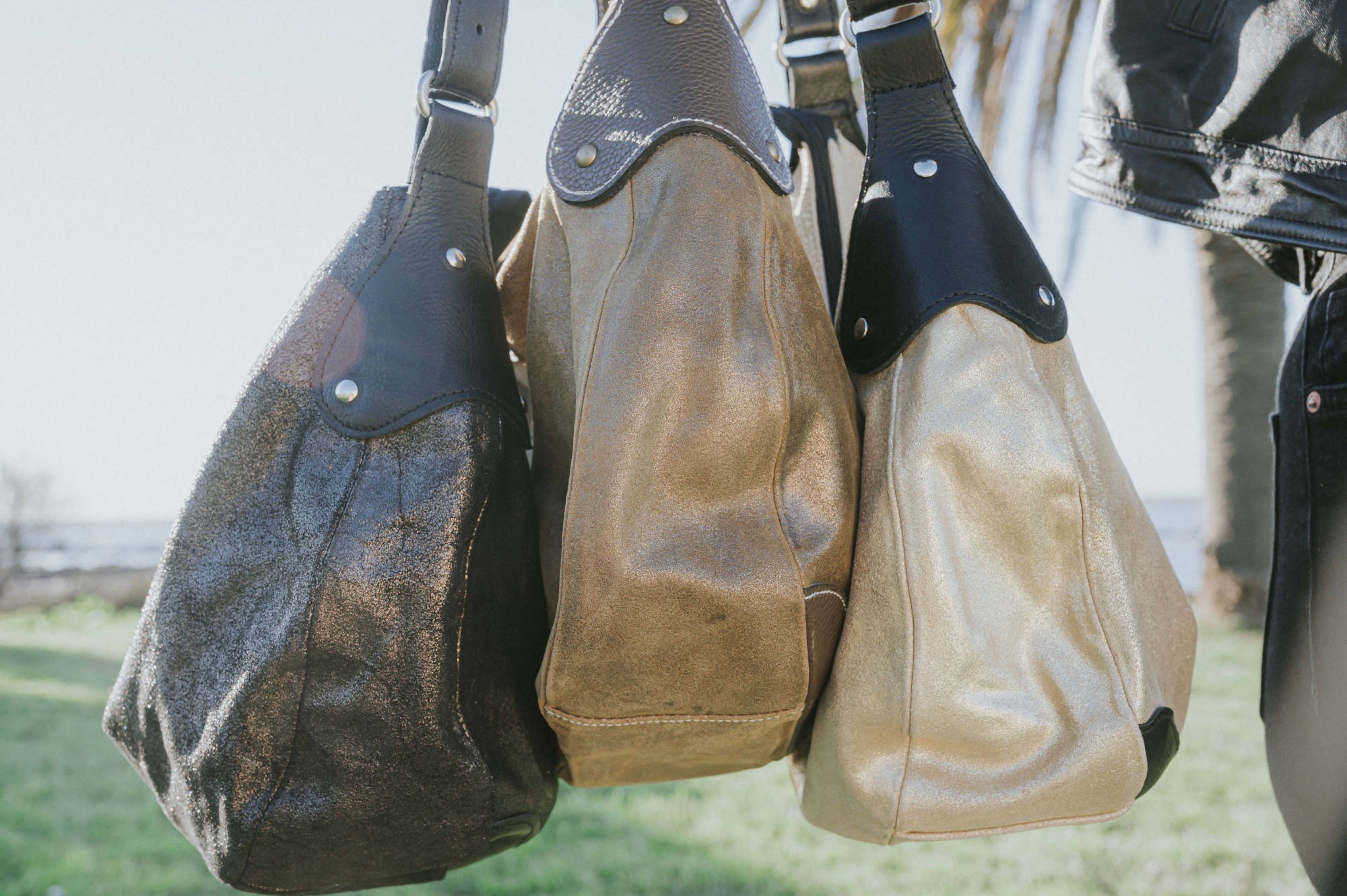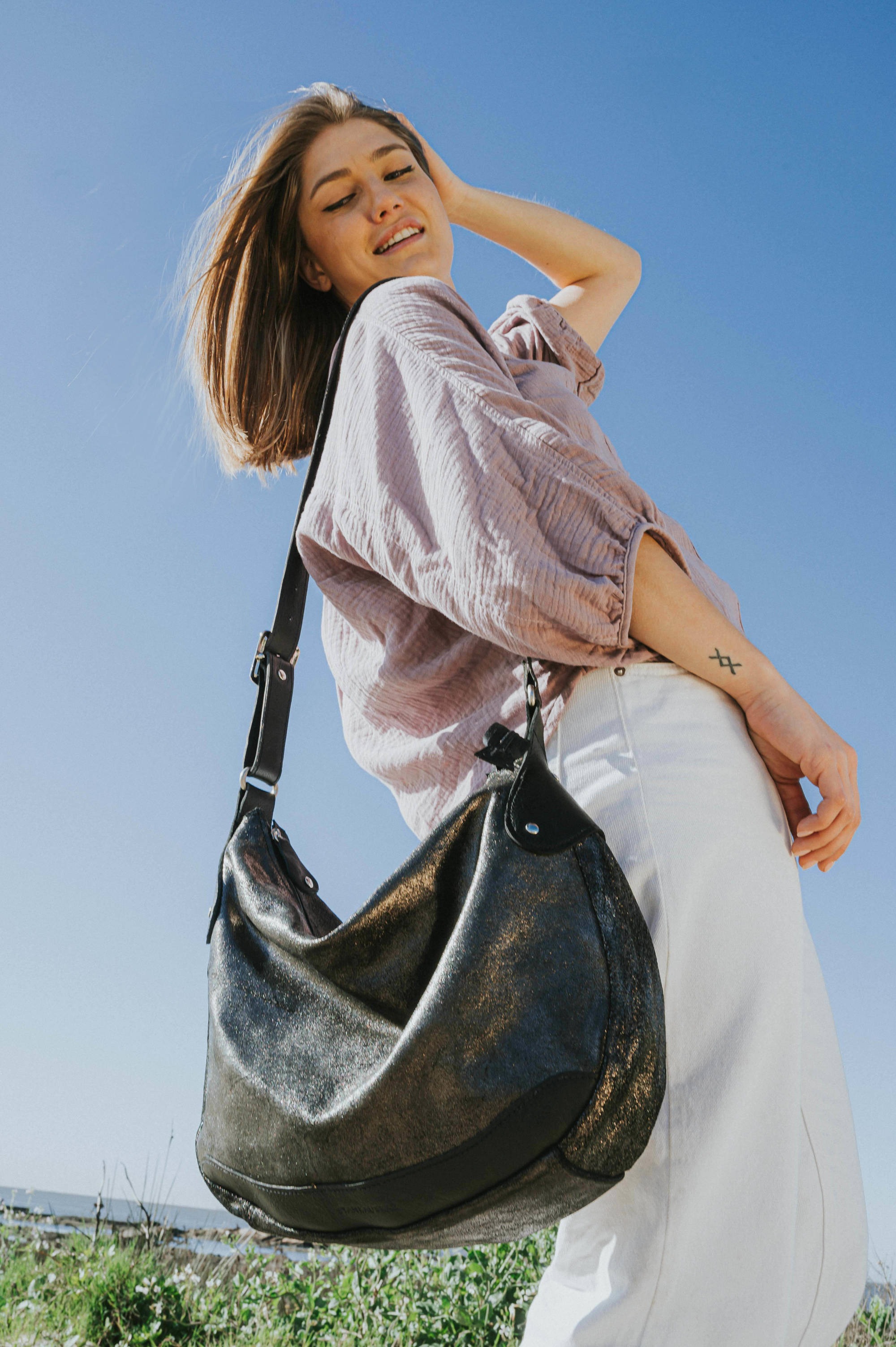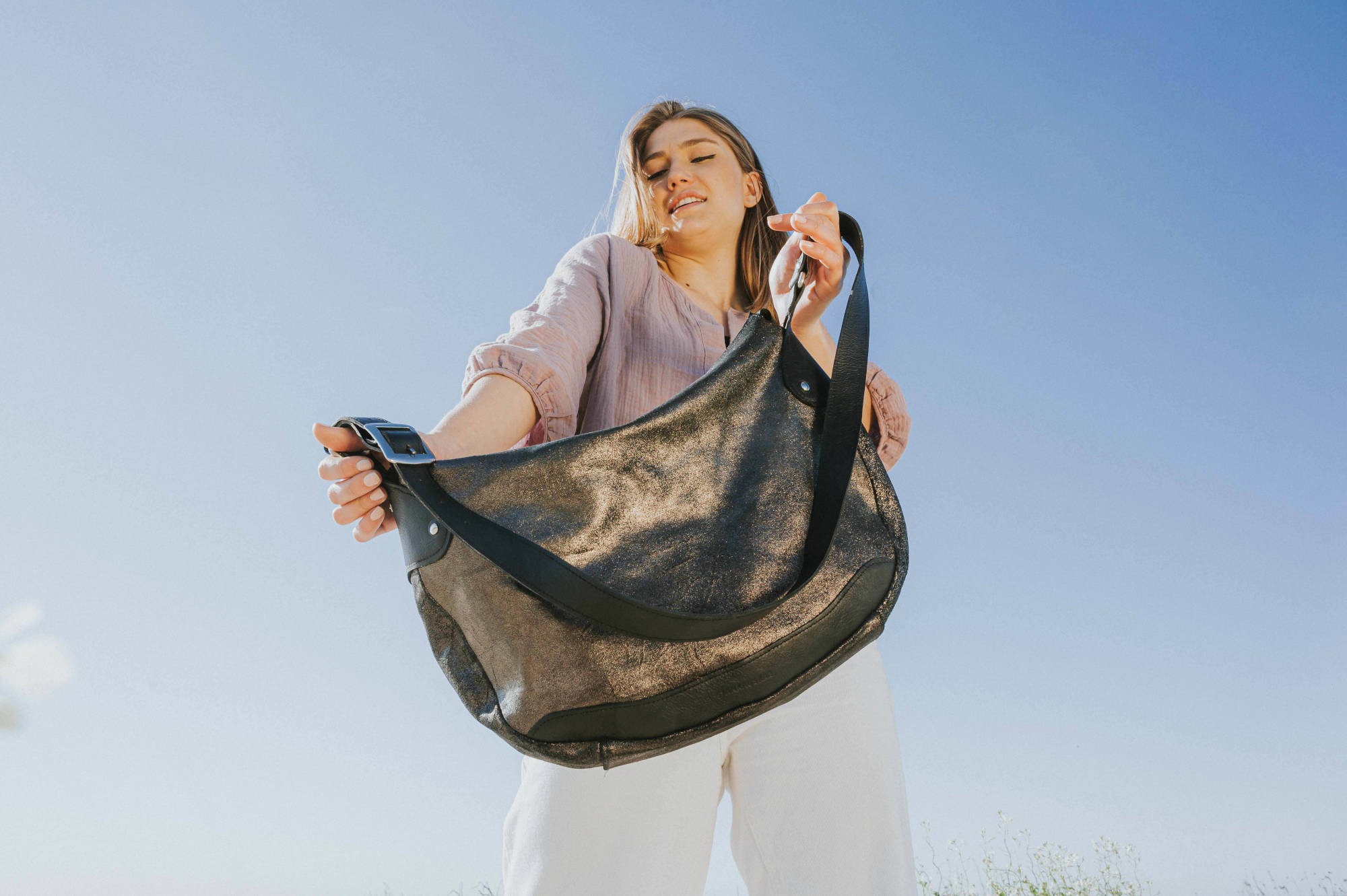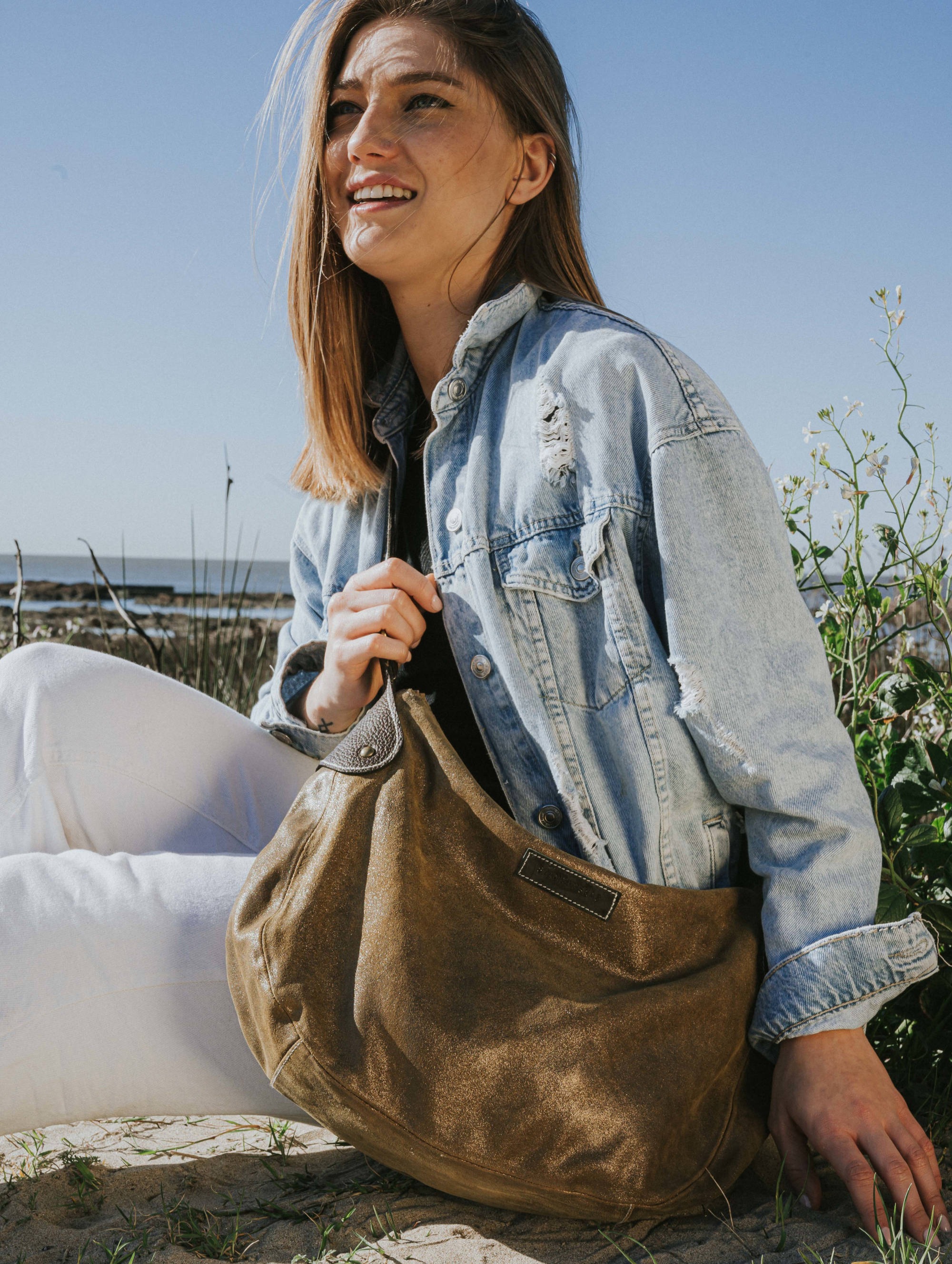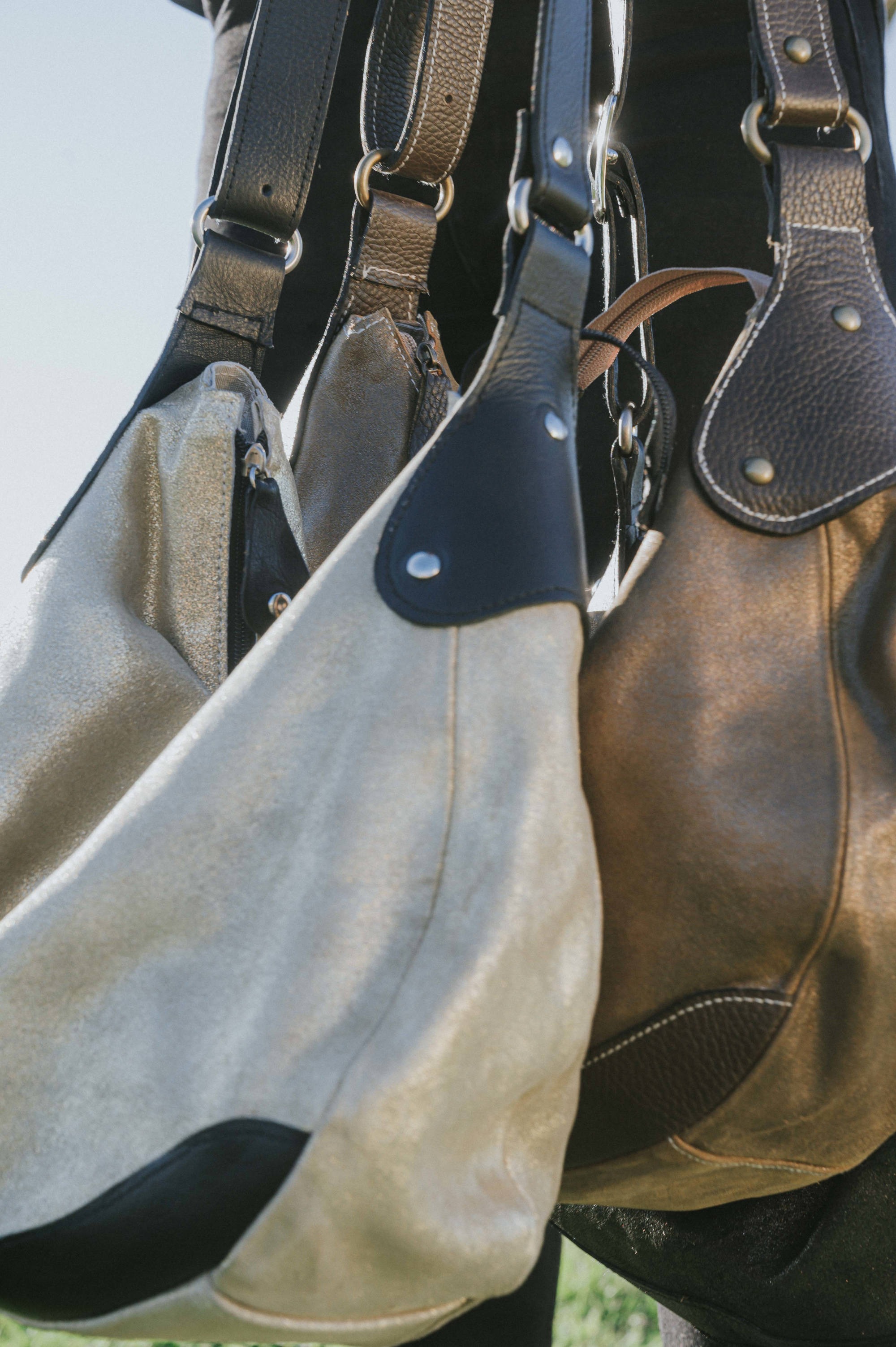 Morral de cuero con efecto metalizado, combinado con cuero napa en correa y detalles. Cierre superior, forrado interior con bolsillo con cierre. Manija larga regulable con hebilla. Medidas 30 cm de base x 10 cm de profundidad y 28 cm de alto.