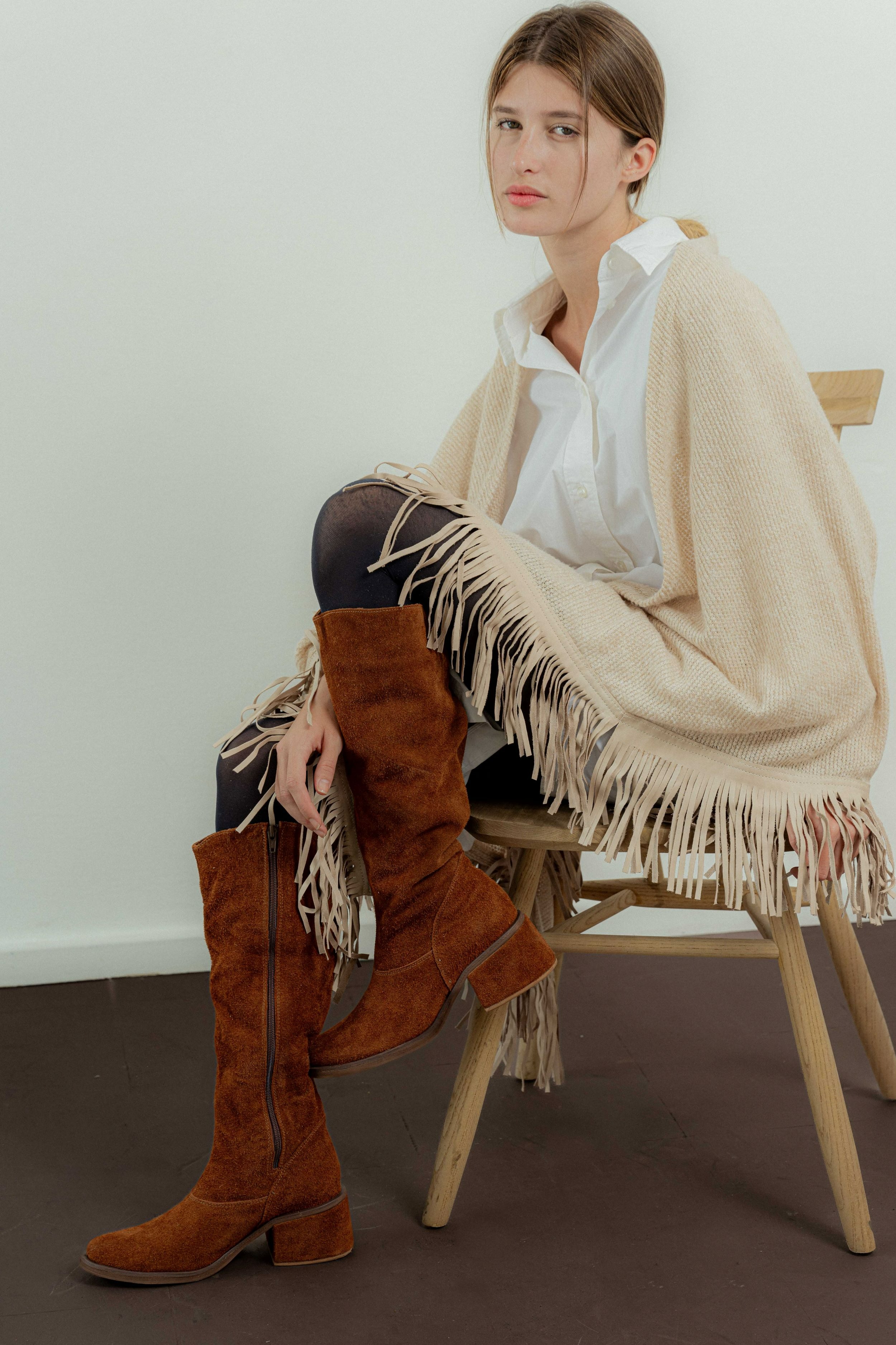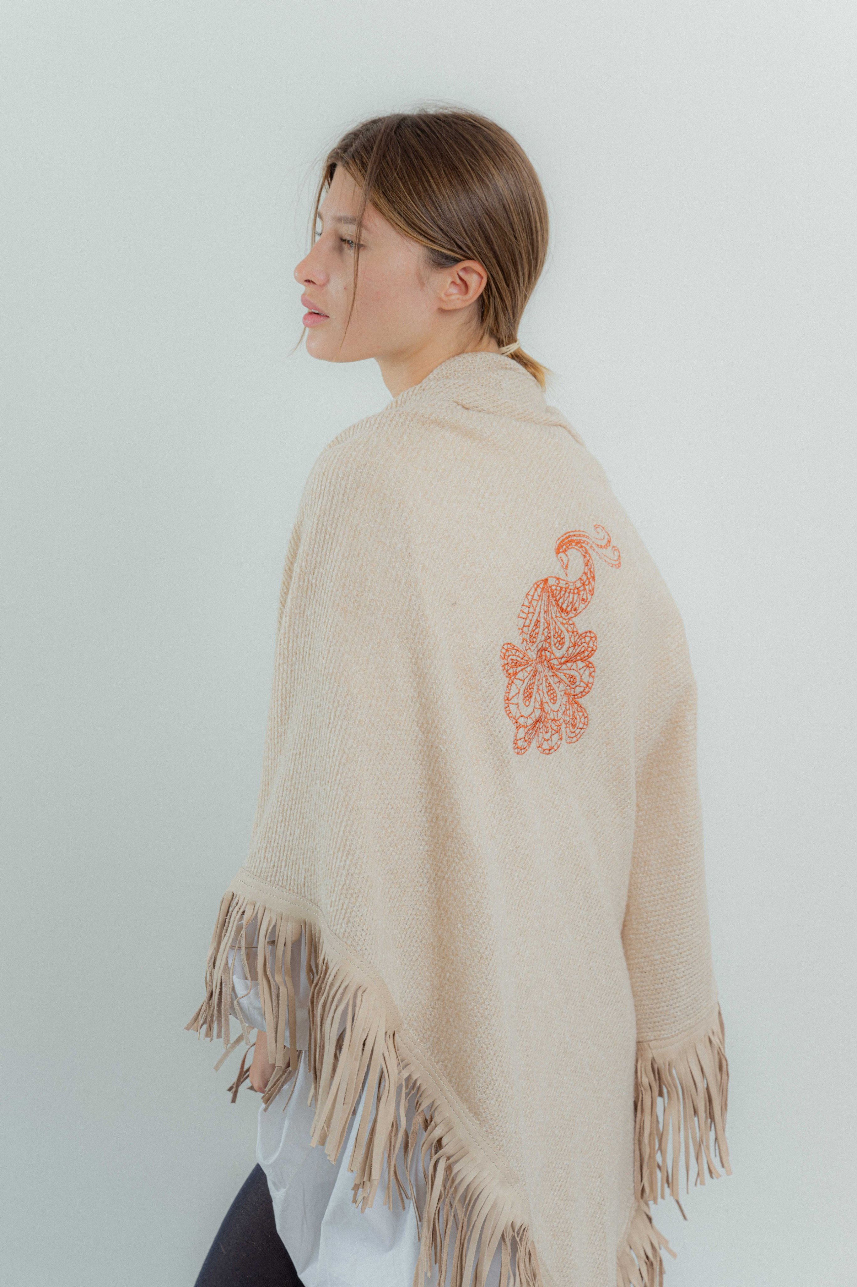Chal tejido con flecos de cuero y bordado en la espalda. Tejido color beige, flecos beige u oxido (el color seleccionado es el color del cuero ya que el tejido es en ambos el mismo color)