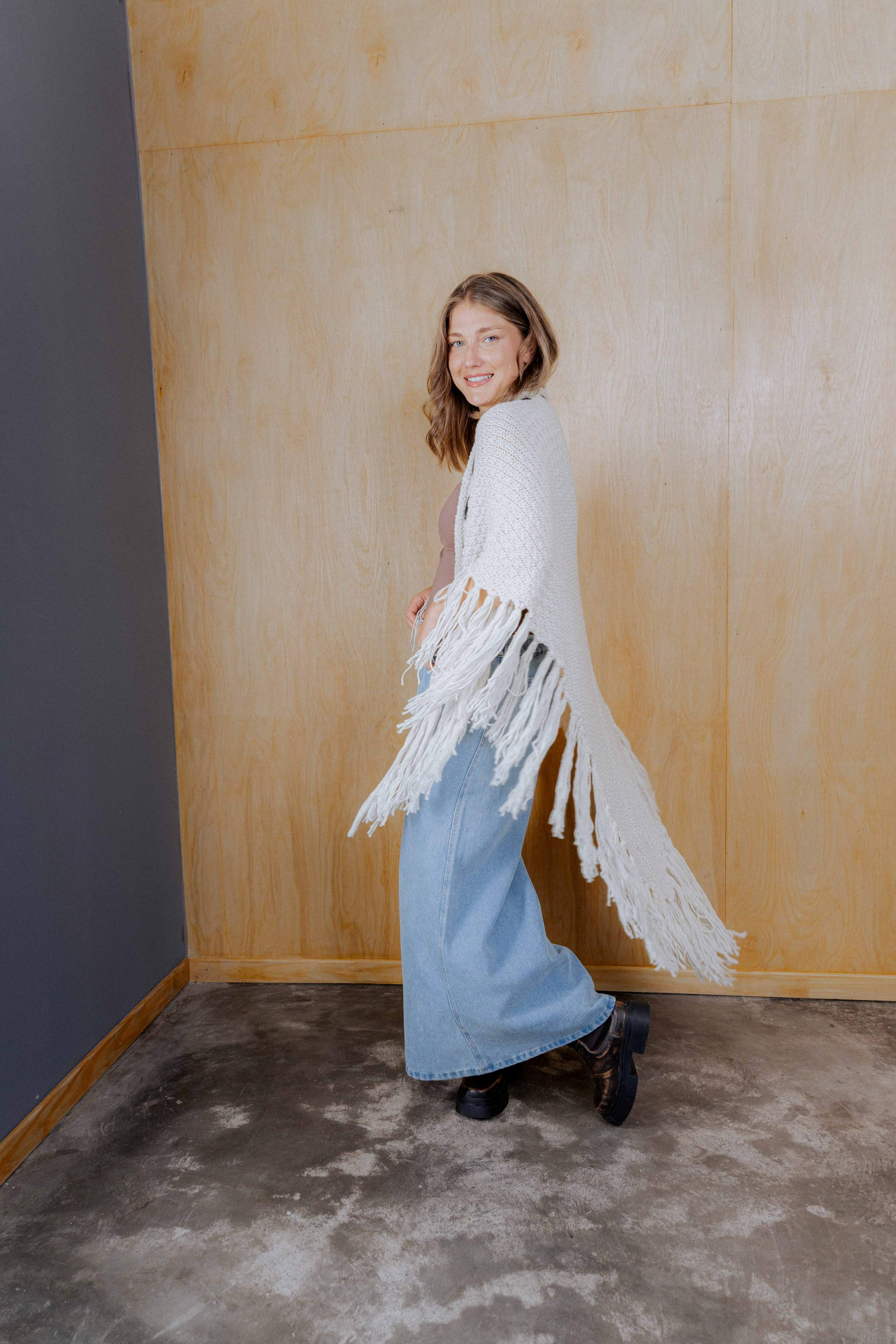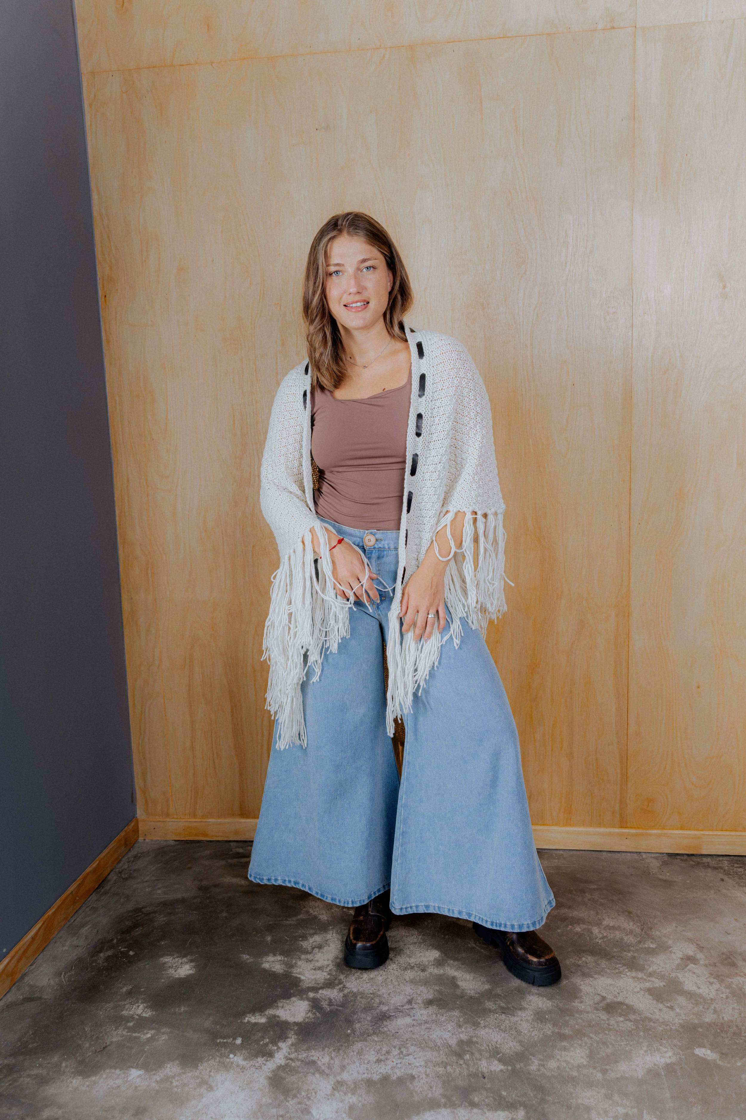 Chal de lana merino natural color crudo, con trenzado de cuero. Con un punto super delicado y terminaciones que son muy suaves vas a amar completar tu look con este chal. El cuero que lleva en el trenzado puede ser al tono, tostado o negro. Definir el color en comentarios.