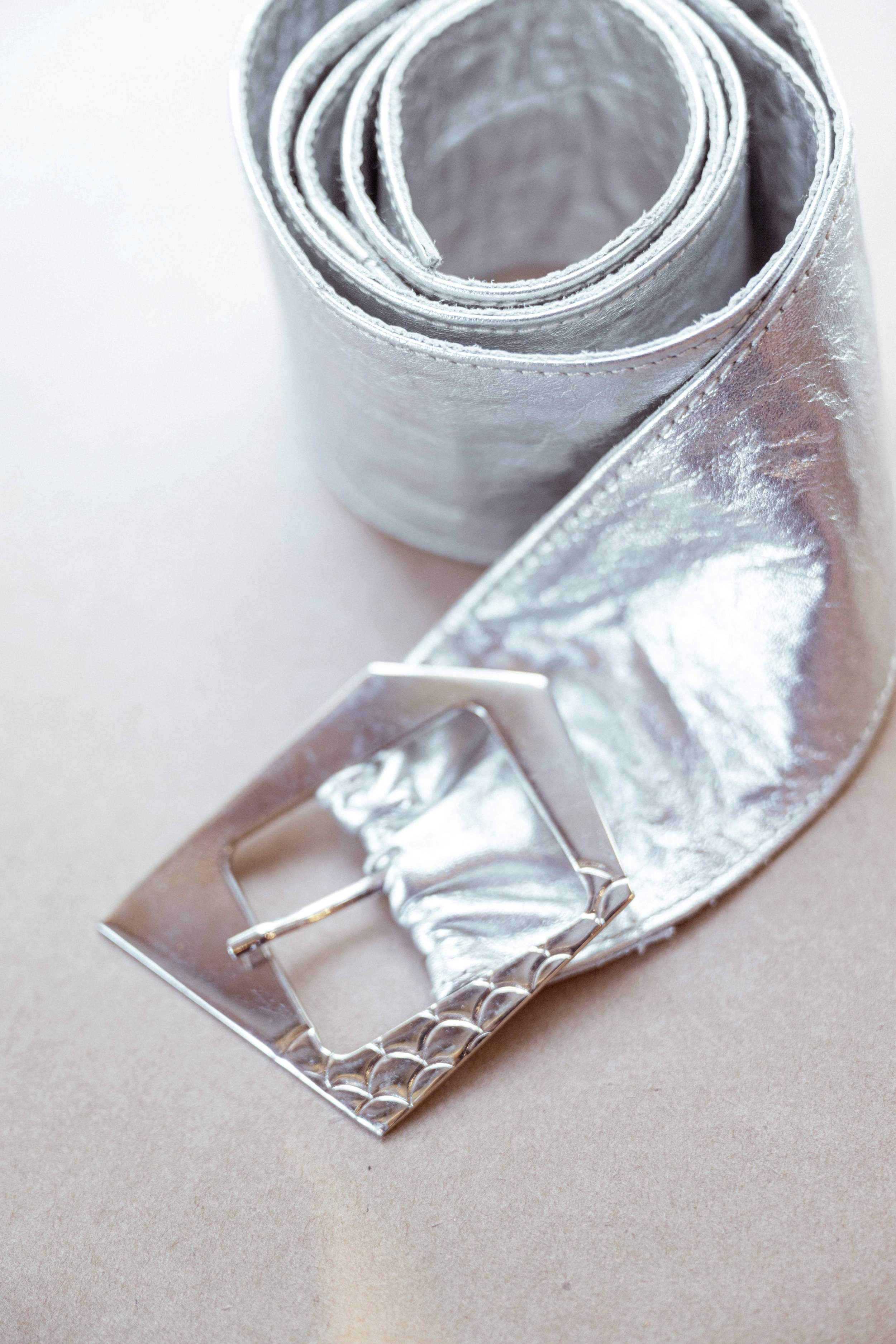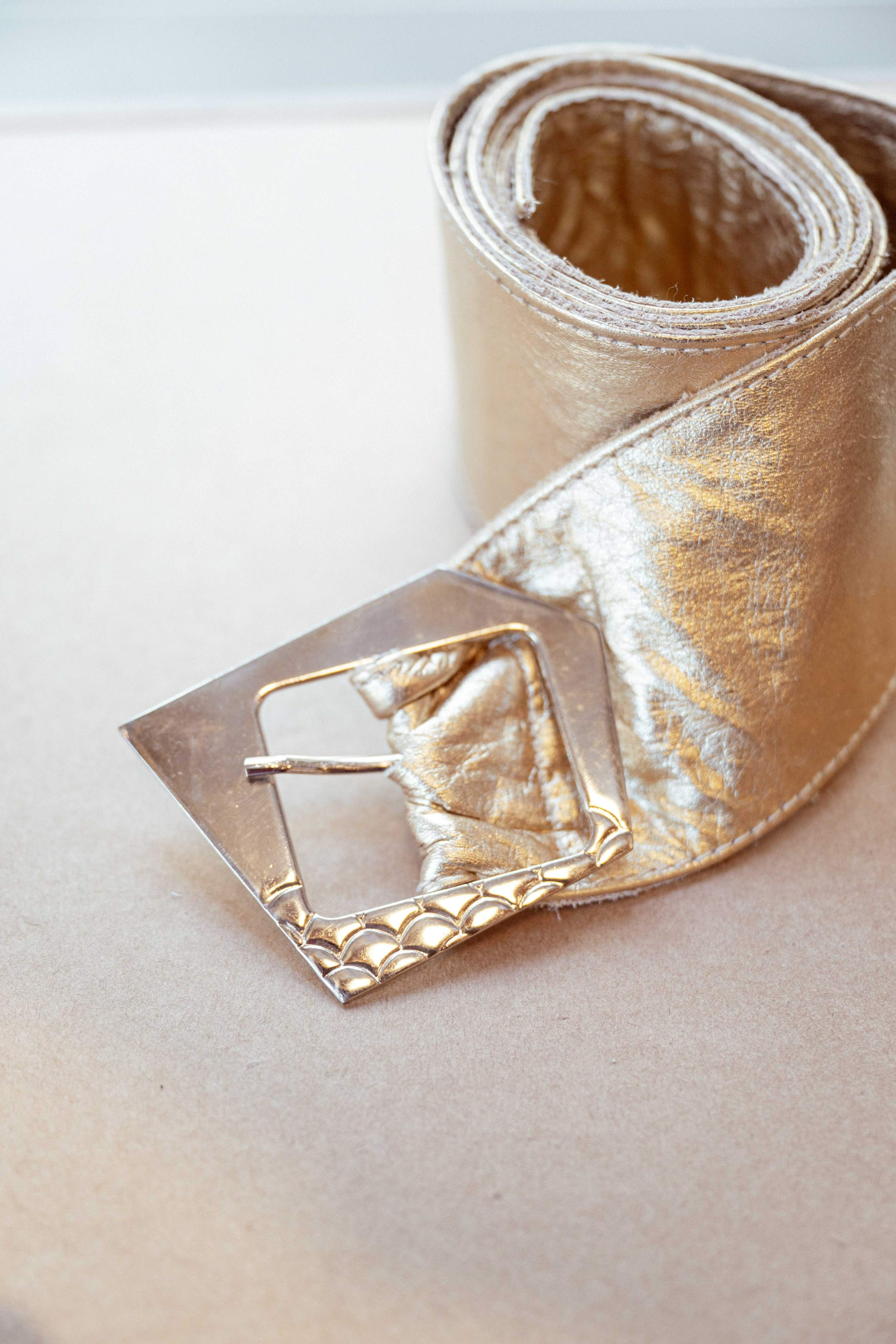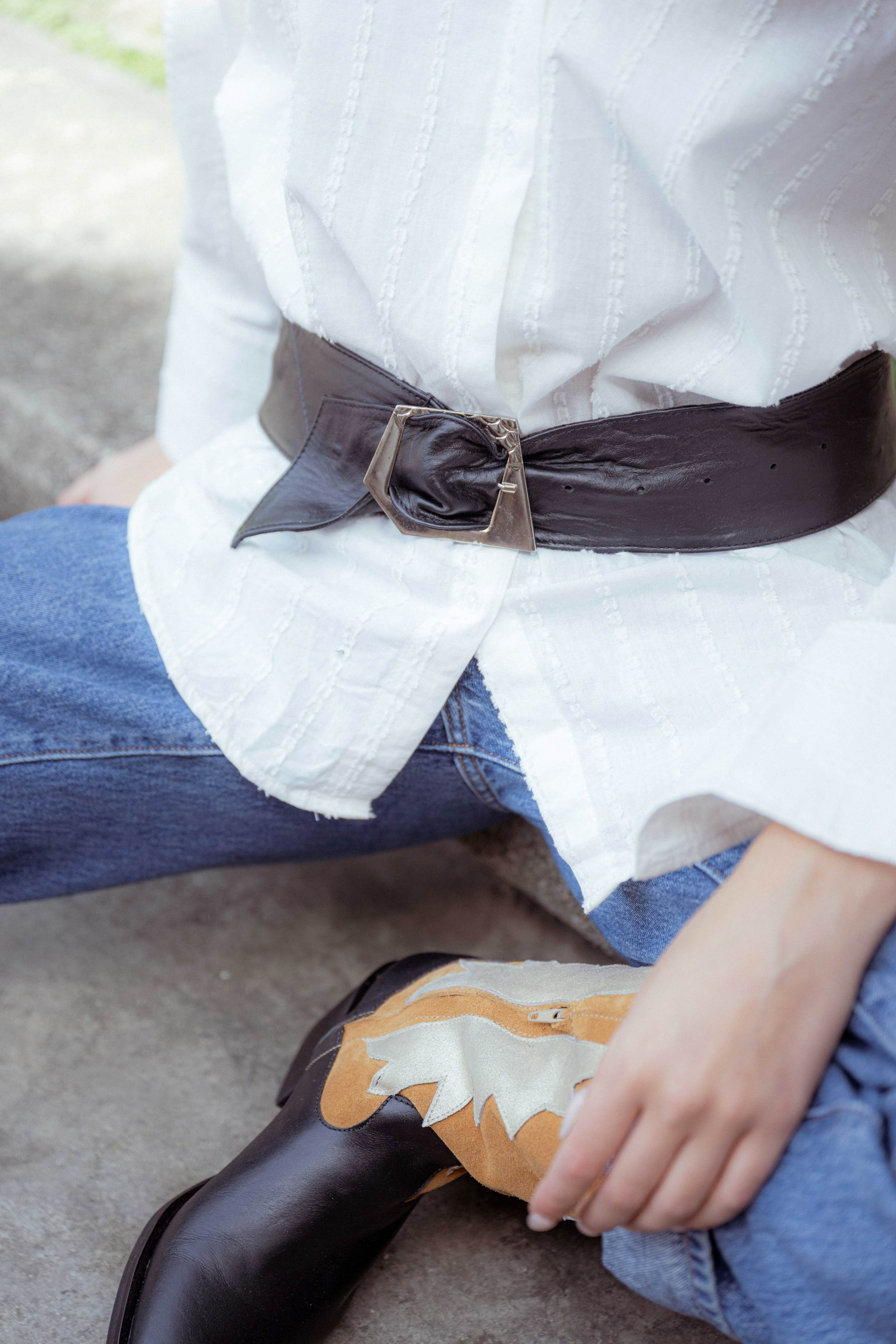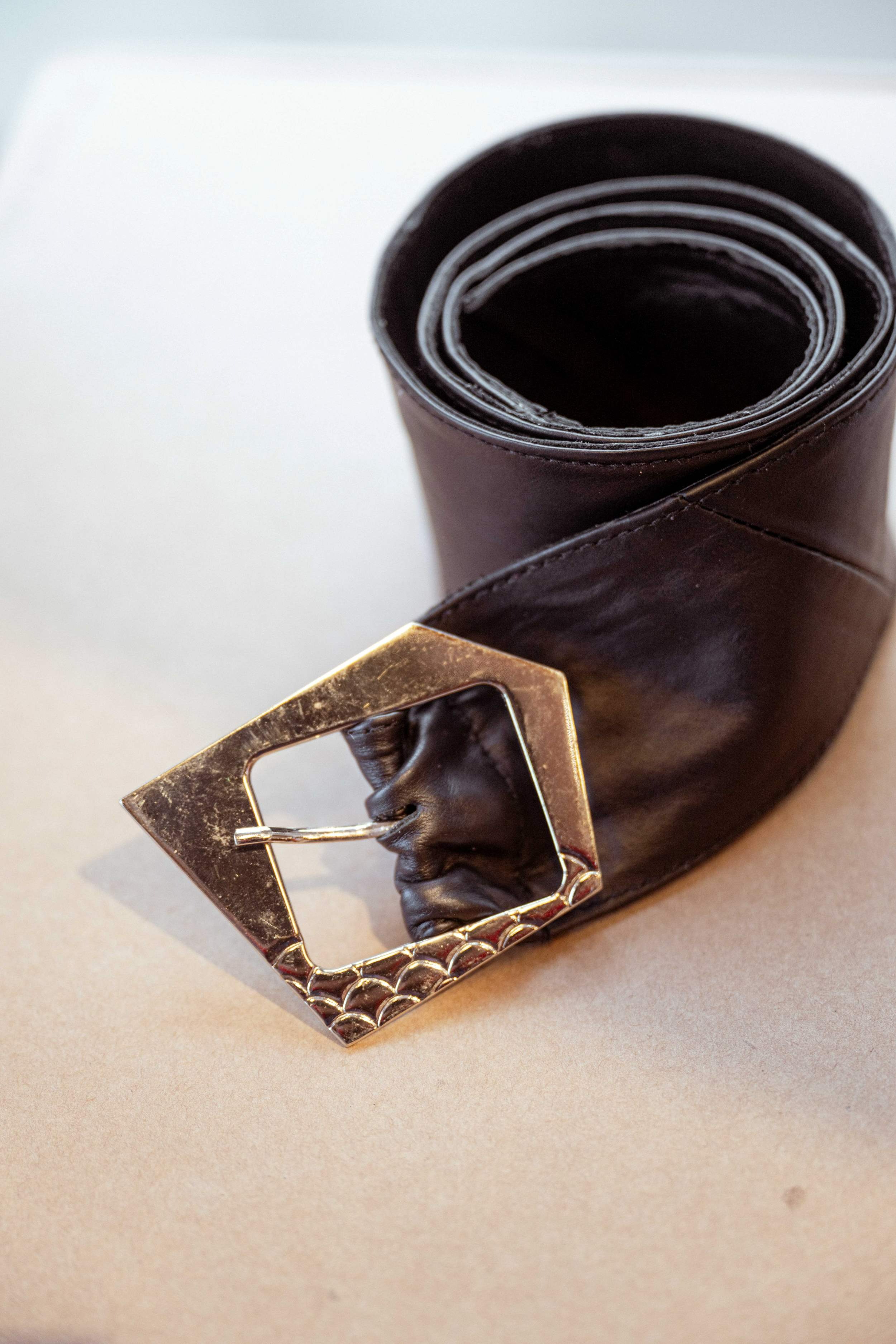Cinto de cuero ancho de 6.5 cm Forrado de cuero, con hebilla niquelada con forma asimétrica.