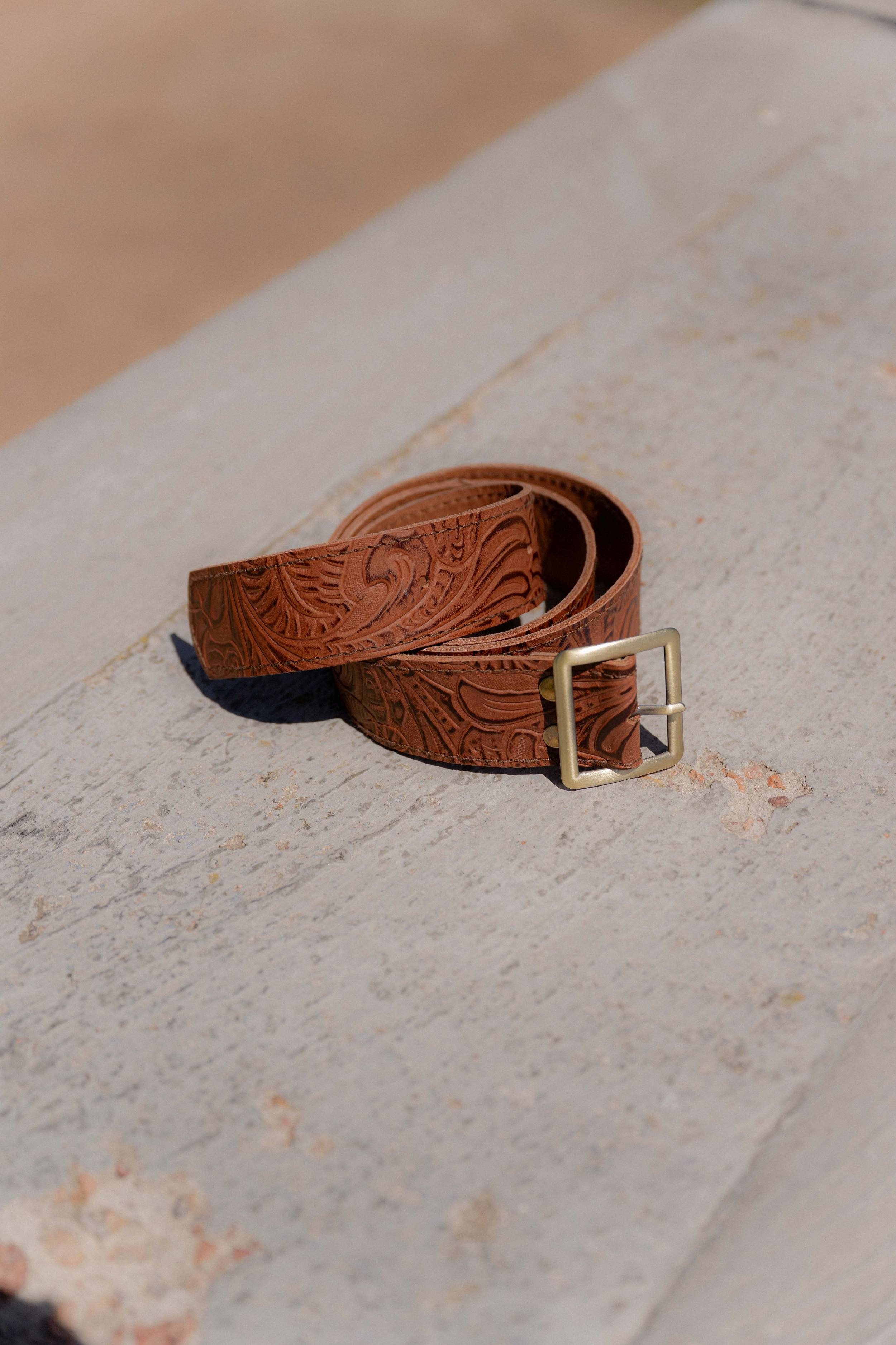 Cinto de cuero labrado, ancho de cuero 3,5 cm. Los talles van hasta 10 cm mas y 5 cm menos de cintura. 100% forrados de cuero y cosidos