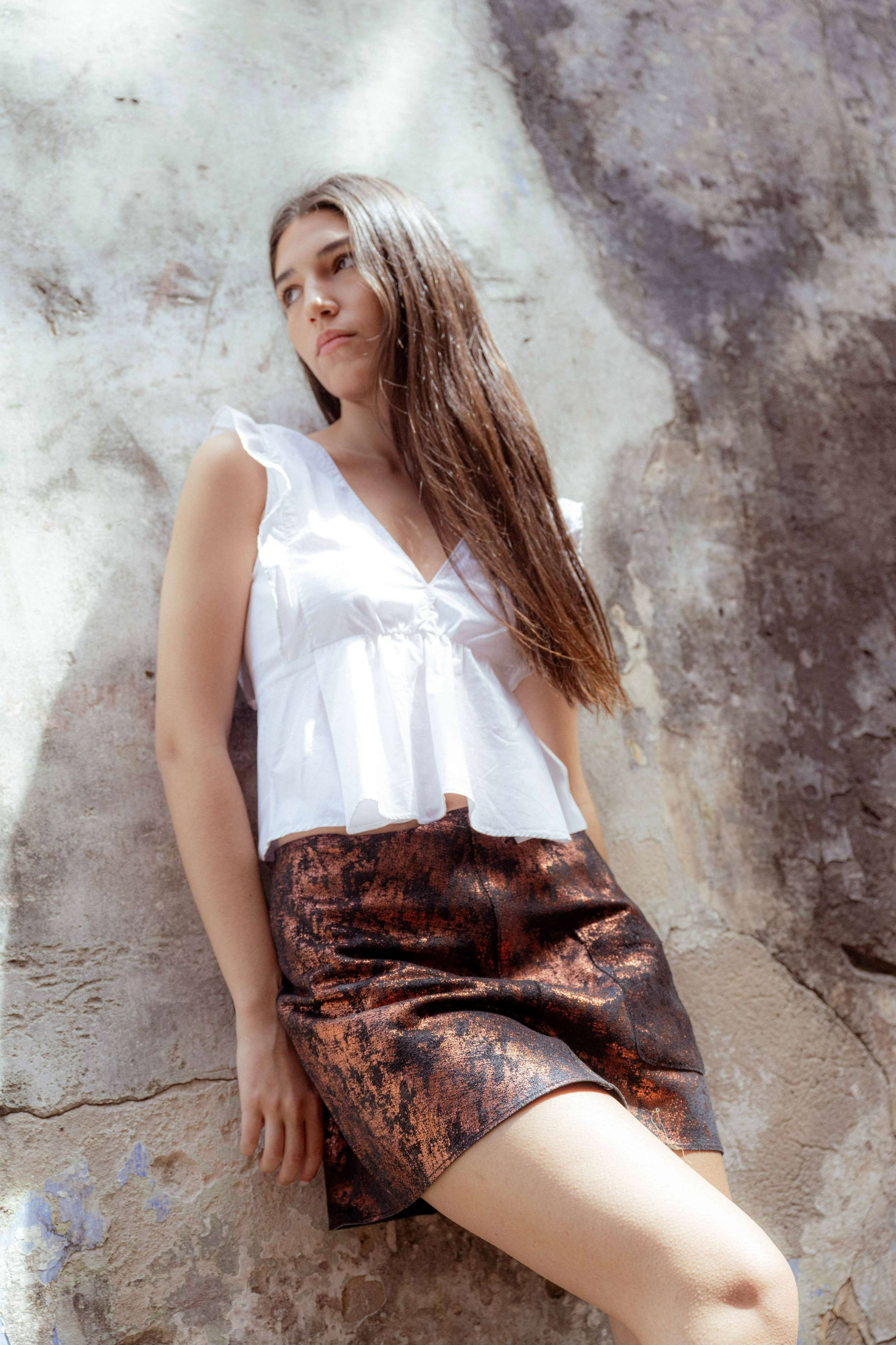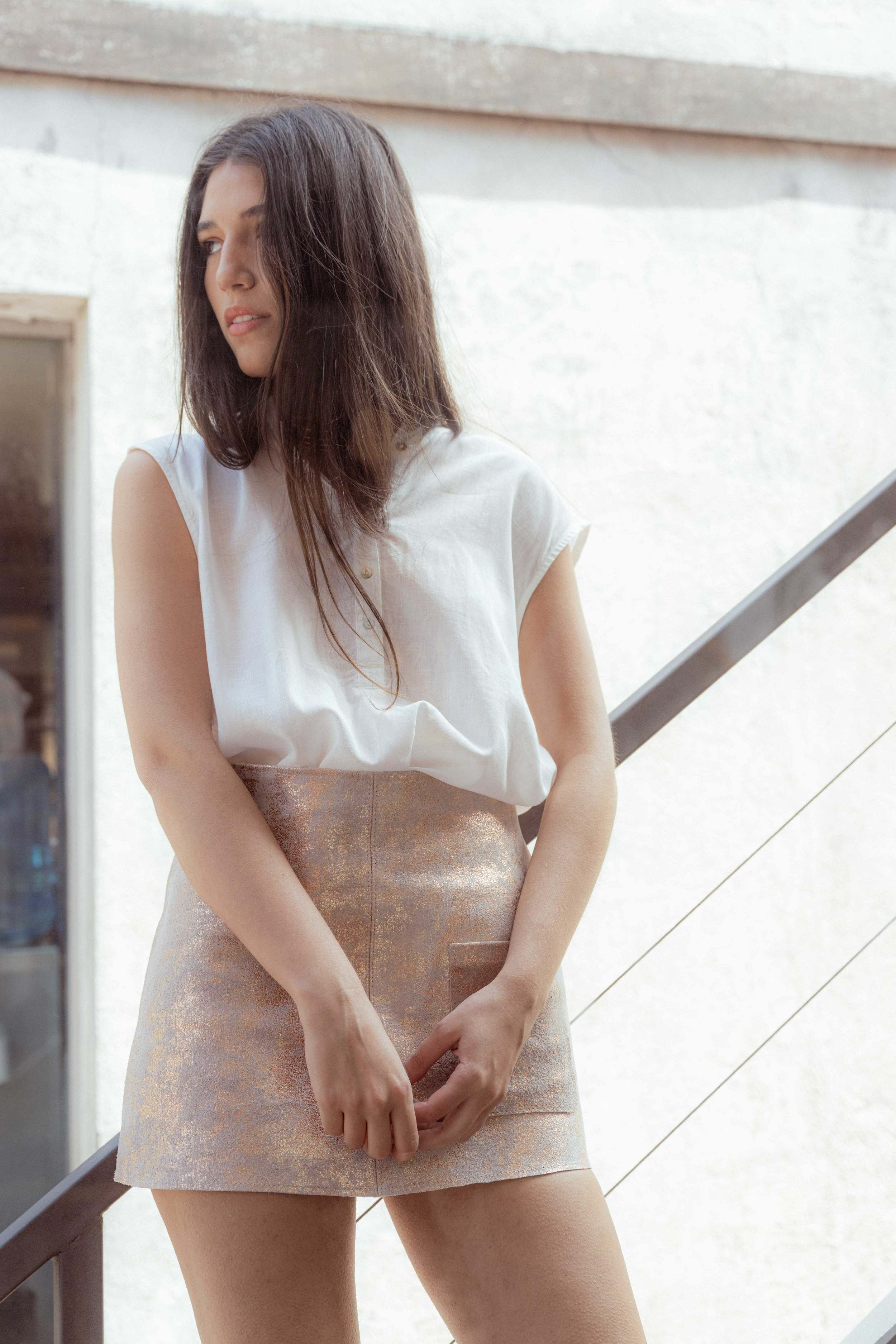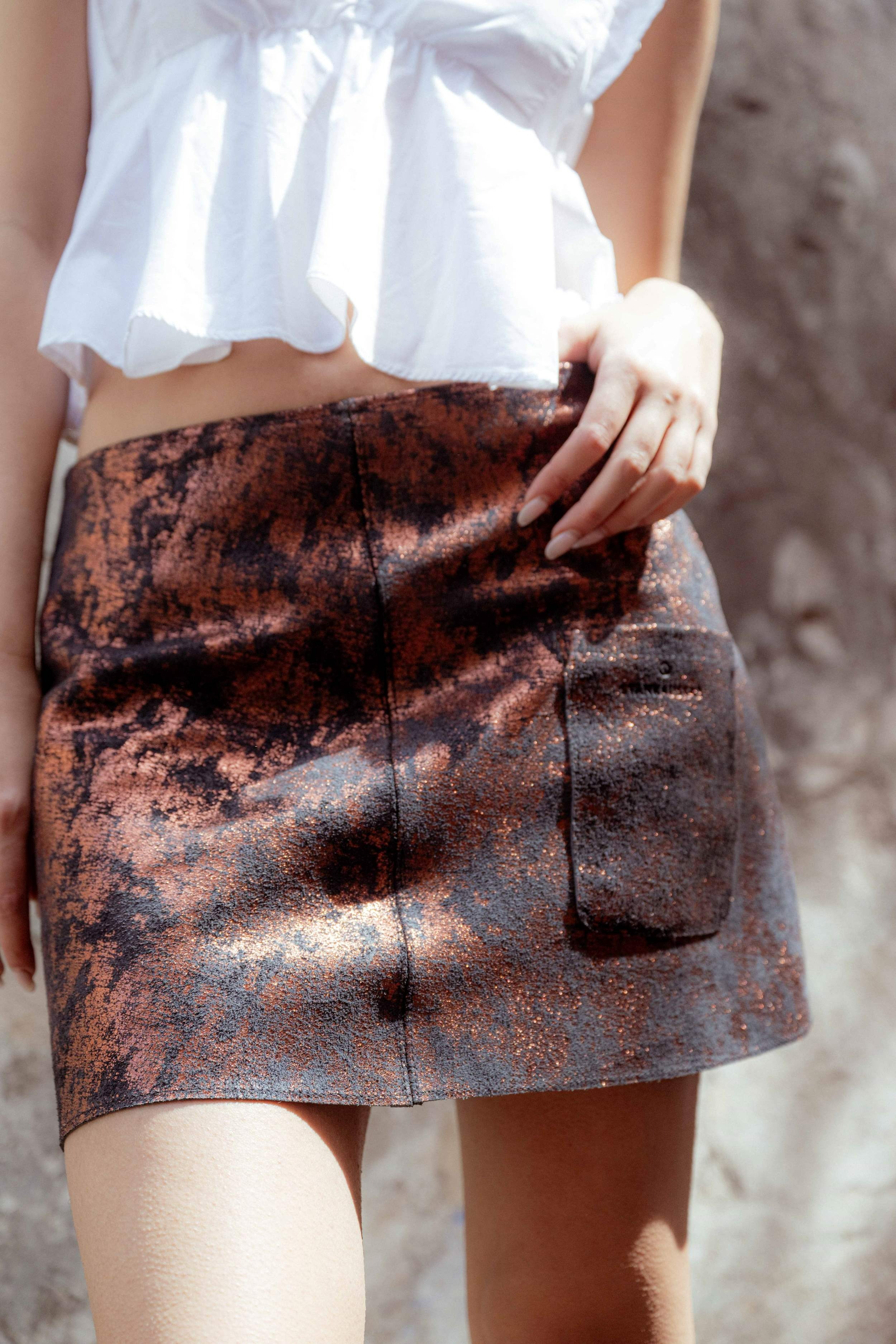 Pollera minifalda de cuero con efecto de brillos. Sin forro, corte adaptable a tiro alto o medio. Cierre en la parte trasera. Medidas Talle S: cintura 80 cm / cadera 92 cm / largo 37 cm Talle M: cintura 82 cm / cadera 100 cm / largo 38 cm Talle L : cintura 86 cm / cadera 104 cm / largo 39 cm