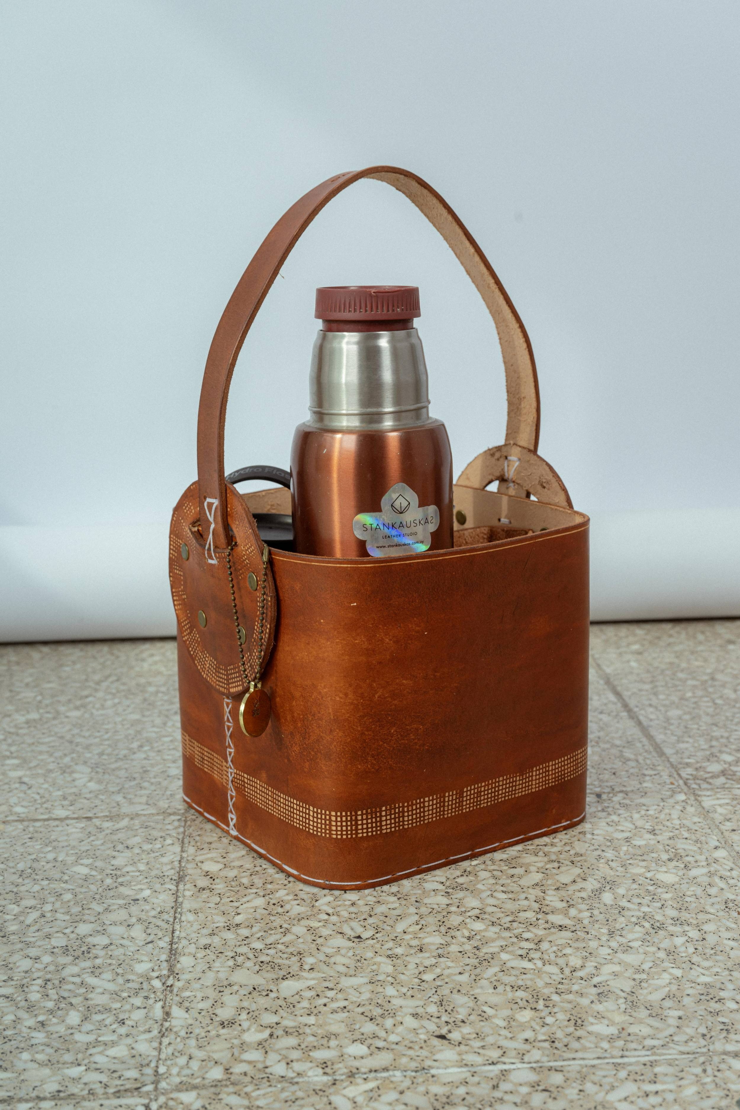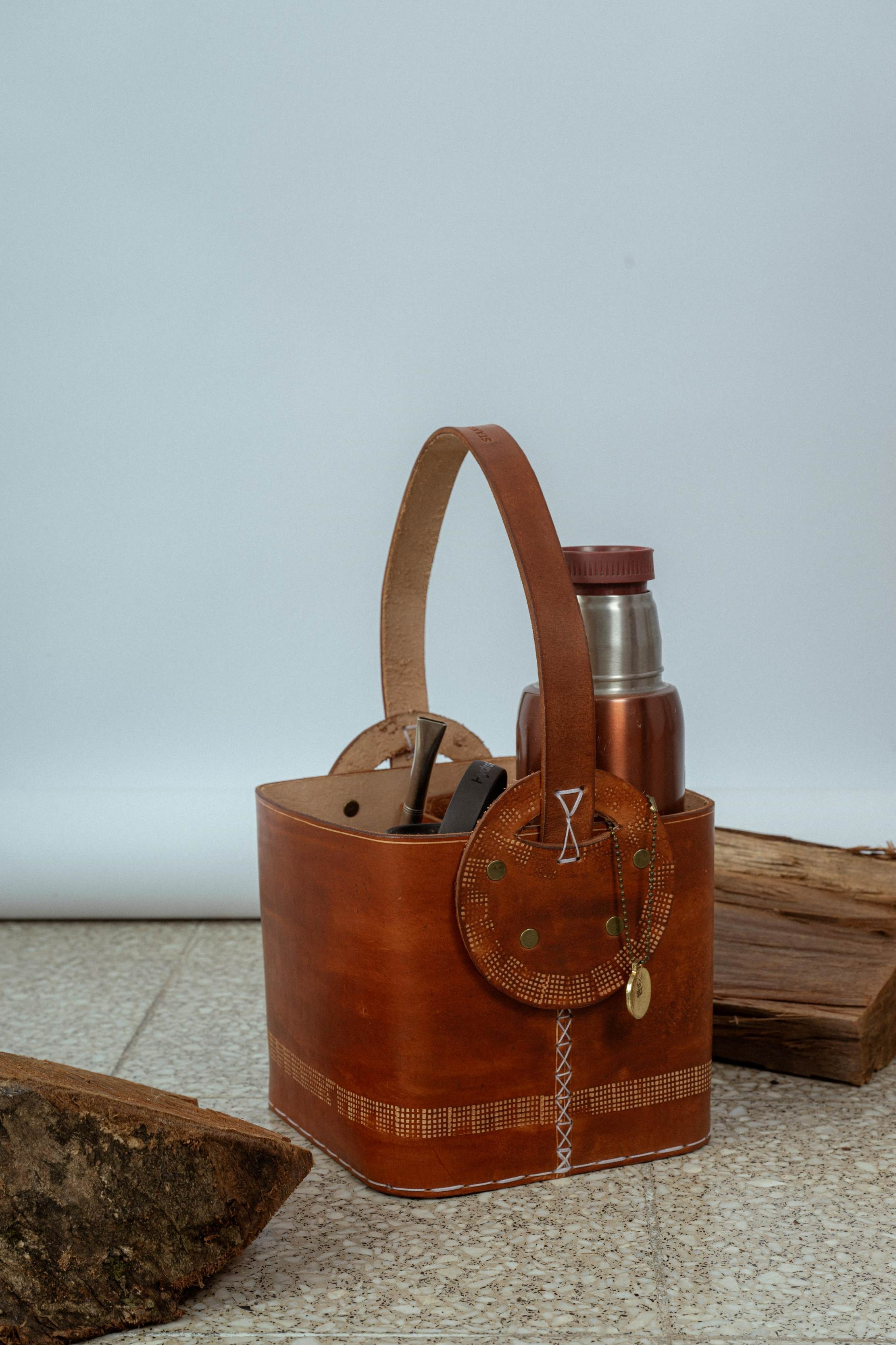 Matera de cuero vaqueta vegetal extra large. Con capacidad para termo, mate, yerba o yerbera y articulos personales. Doble Capacidad de carga. Con base de madera lo que la permite ser apta para el auto. Llevala contigo como un bolsito y cargale todo lo que necesitas.