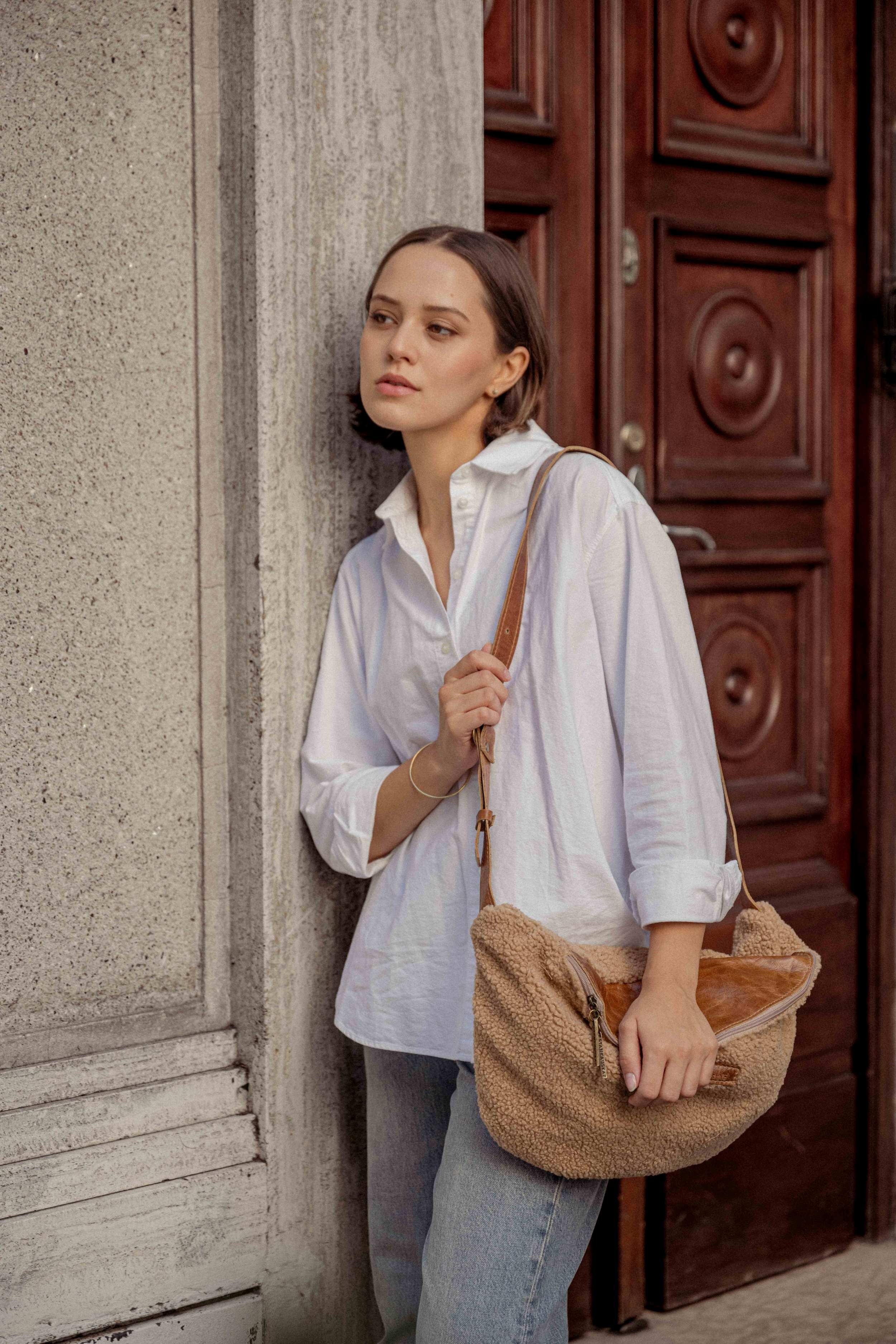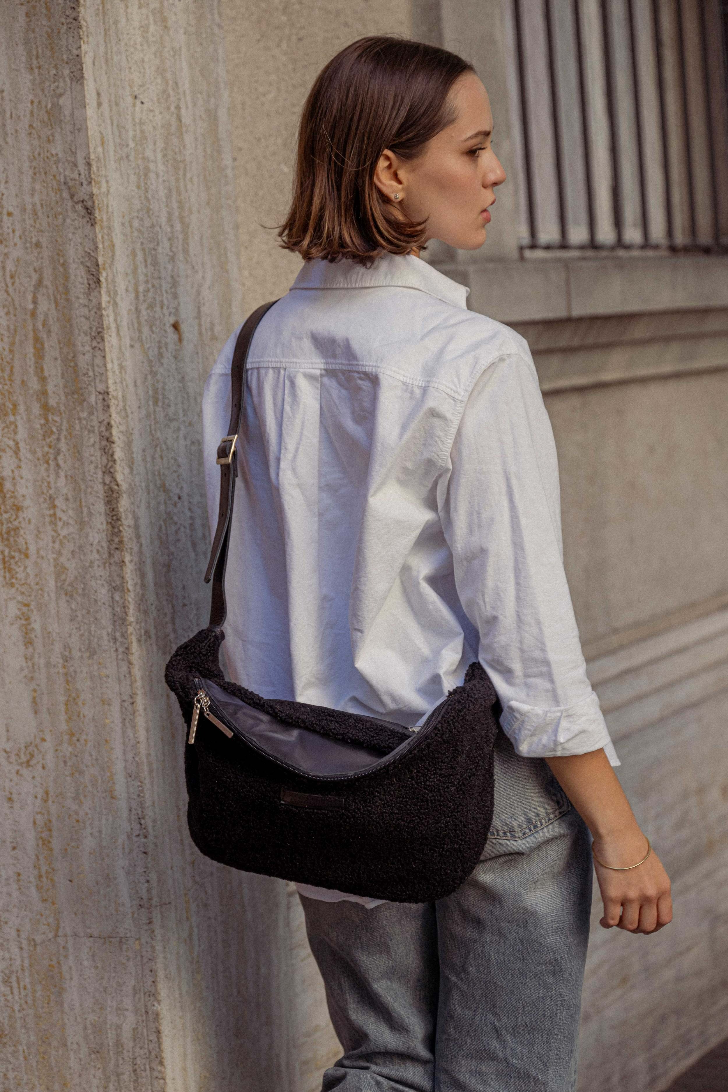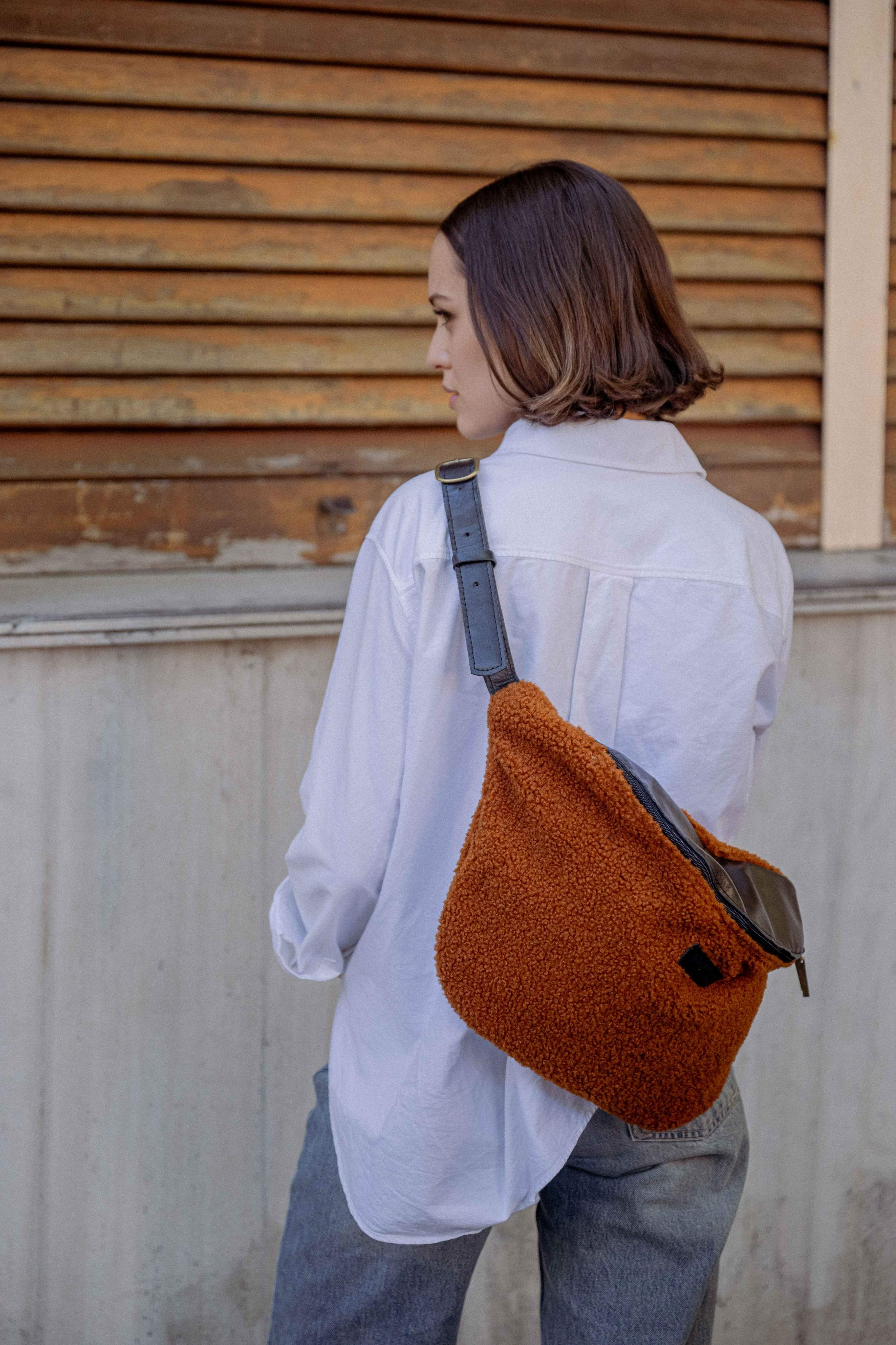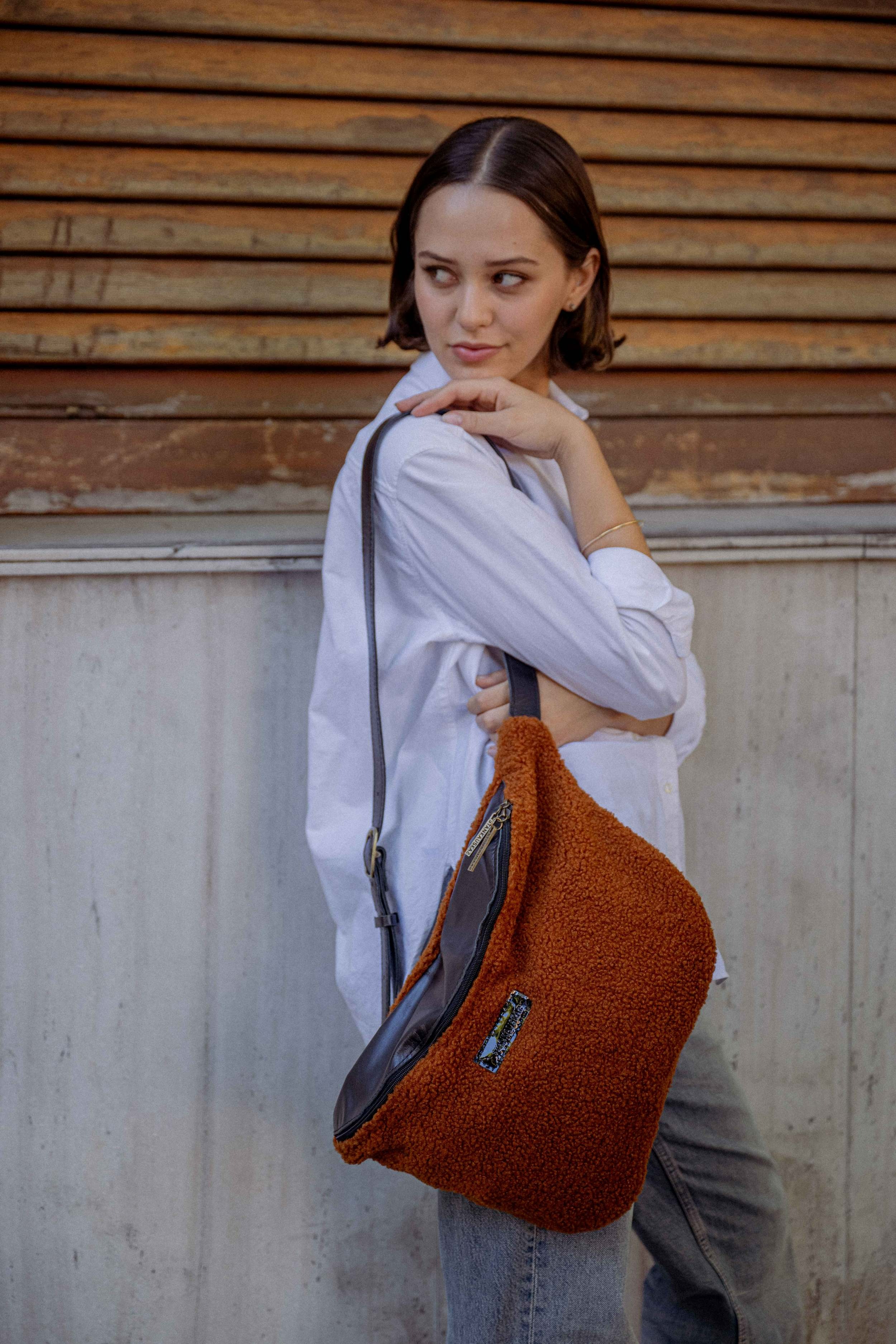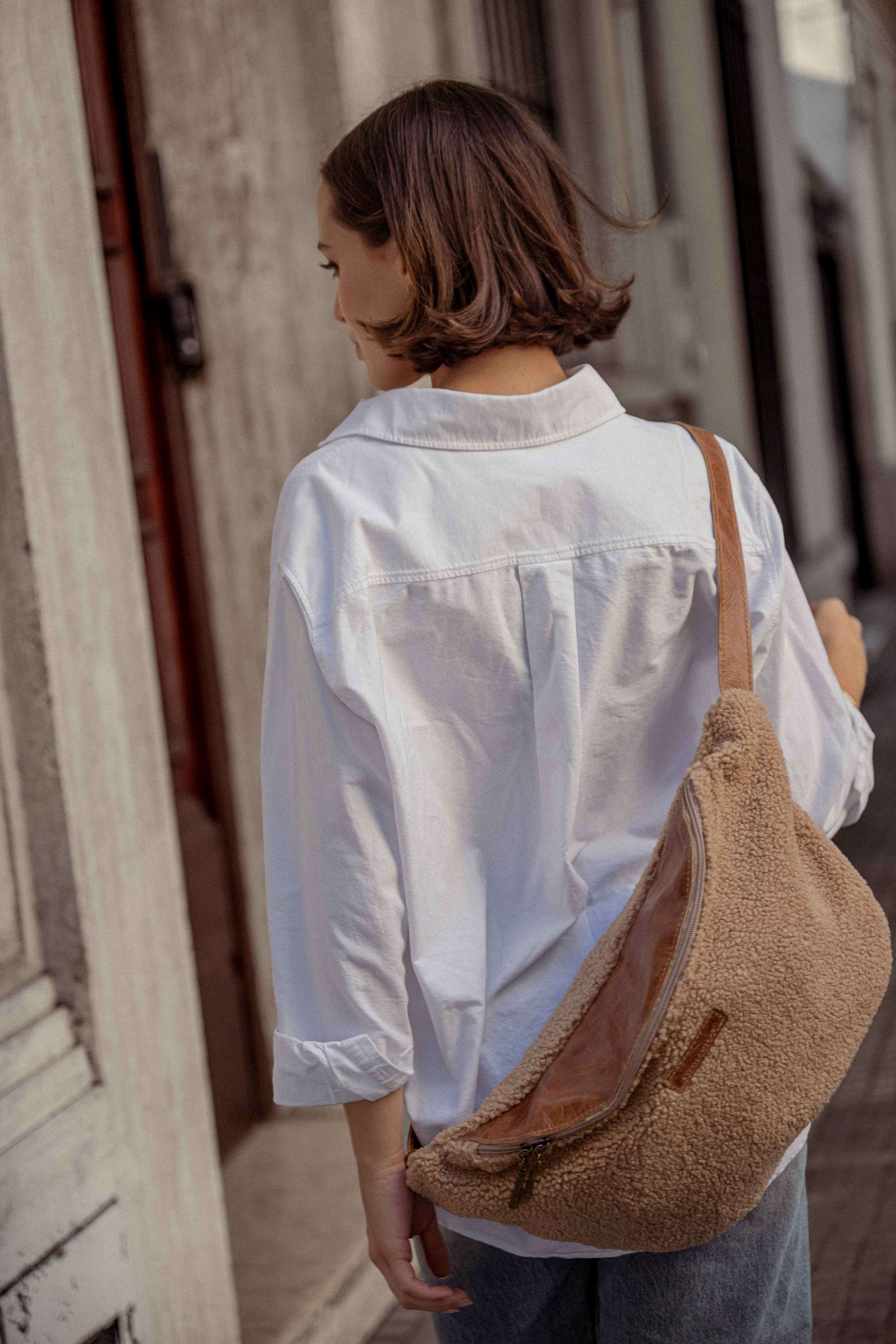 Bolso estilo Riñonera de corderito sintetico con detalles de cuero. Bolsillo posterior con cierre, Manija larga regulable de cuero. Interior forrado con bolsillo Medidas 34 cm de base x 30 cm de alto x 12 cm de profundidad.