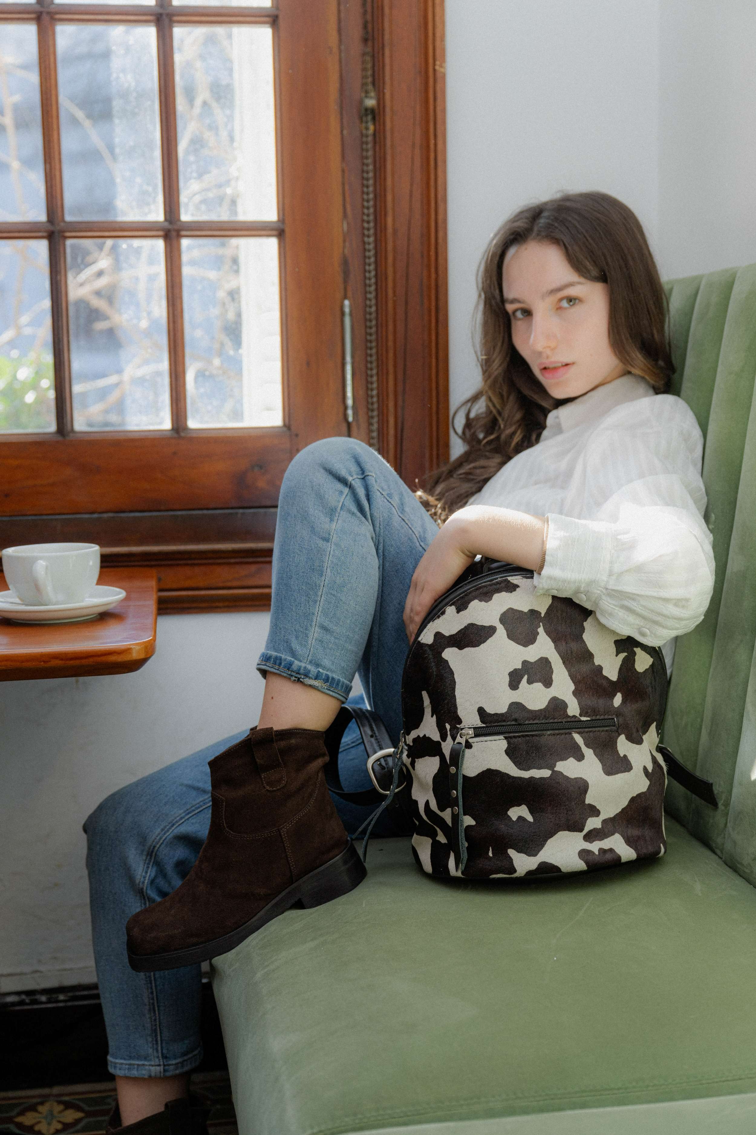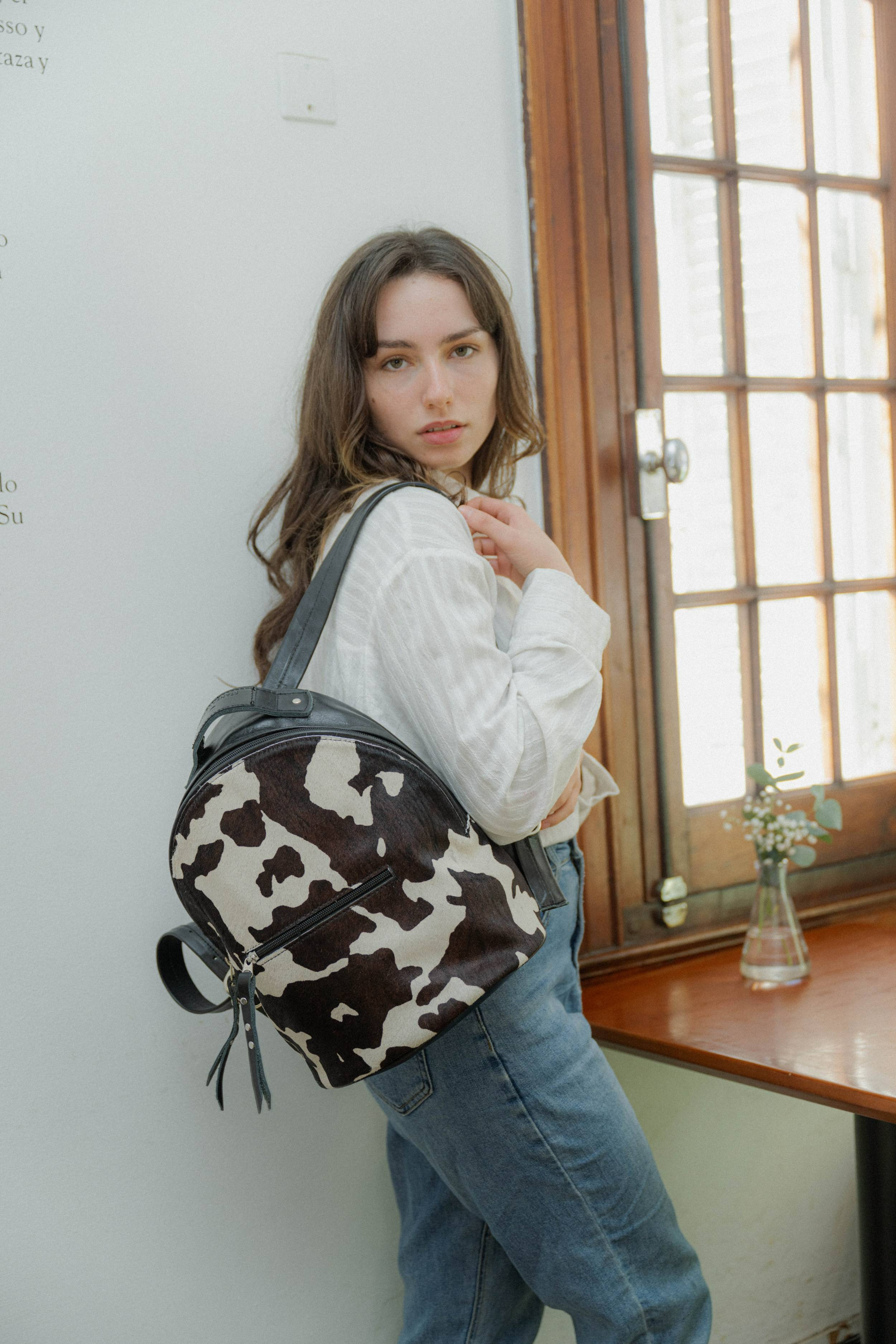 Mochila de cuero con pelo natural estampado de vaca, con bolsillo en el frente. Interior forrado con bolsillo con cierre. Cómoda para llevar en tu día a día. Medidas 25 cm de base x 31 cm de alto x 16 cm de fuelle.