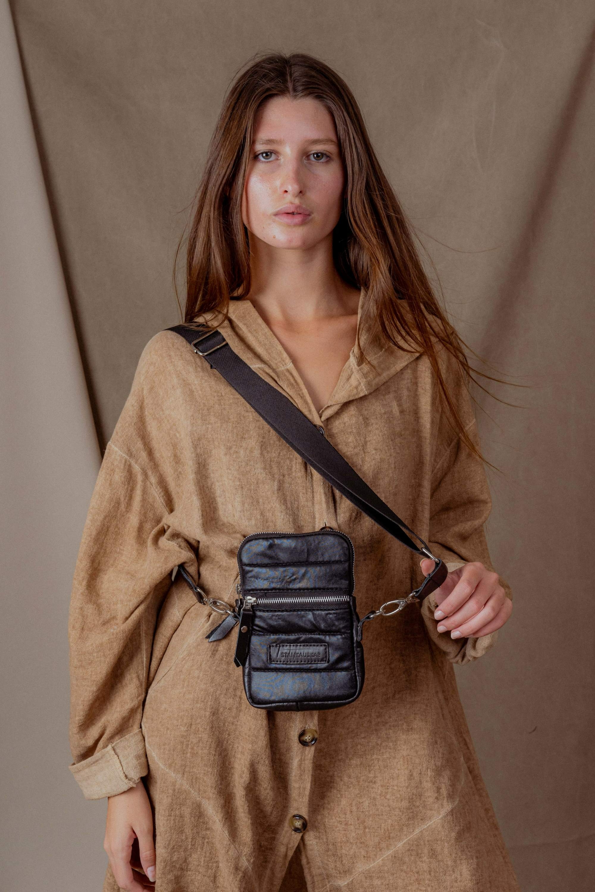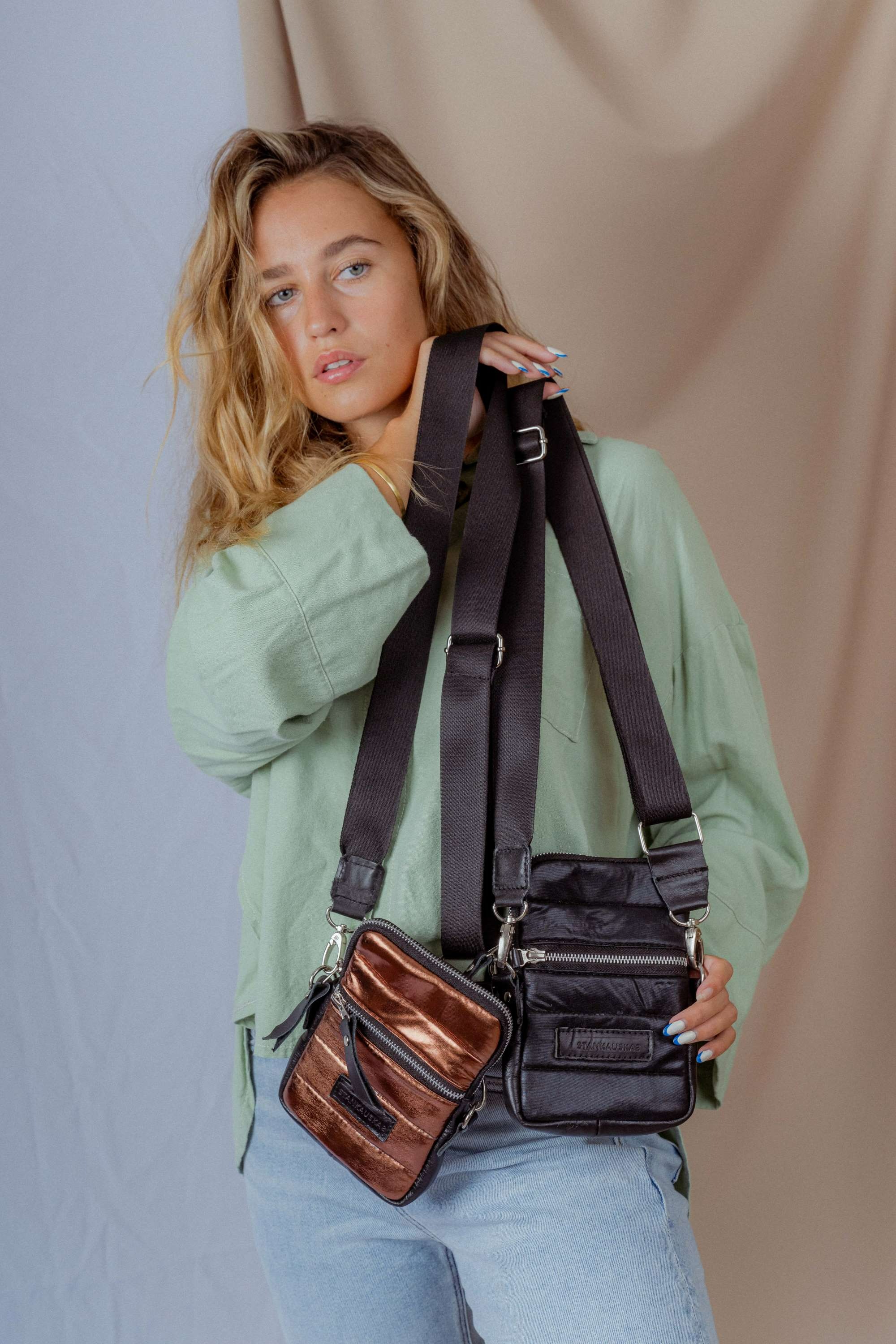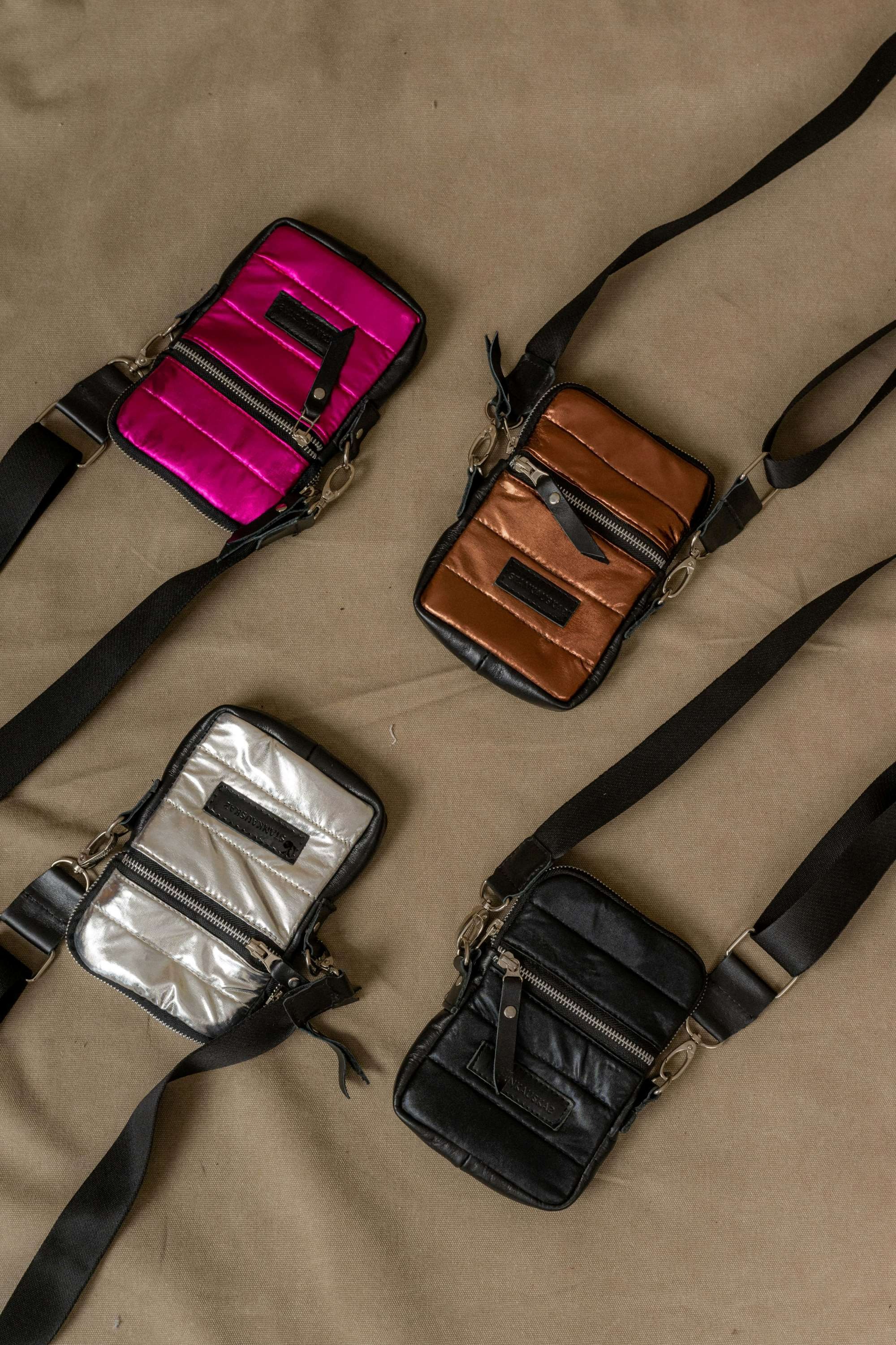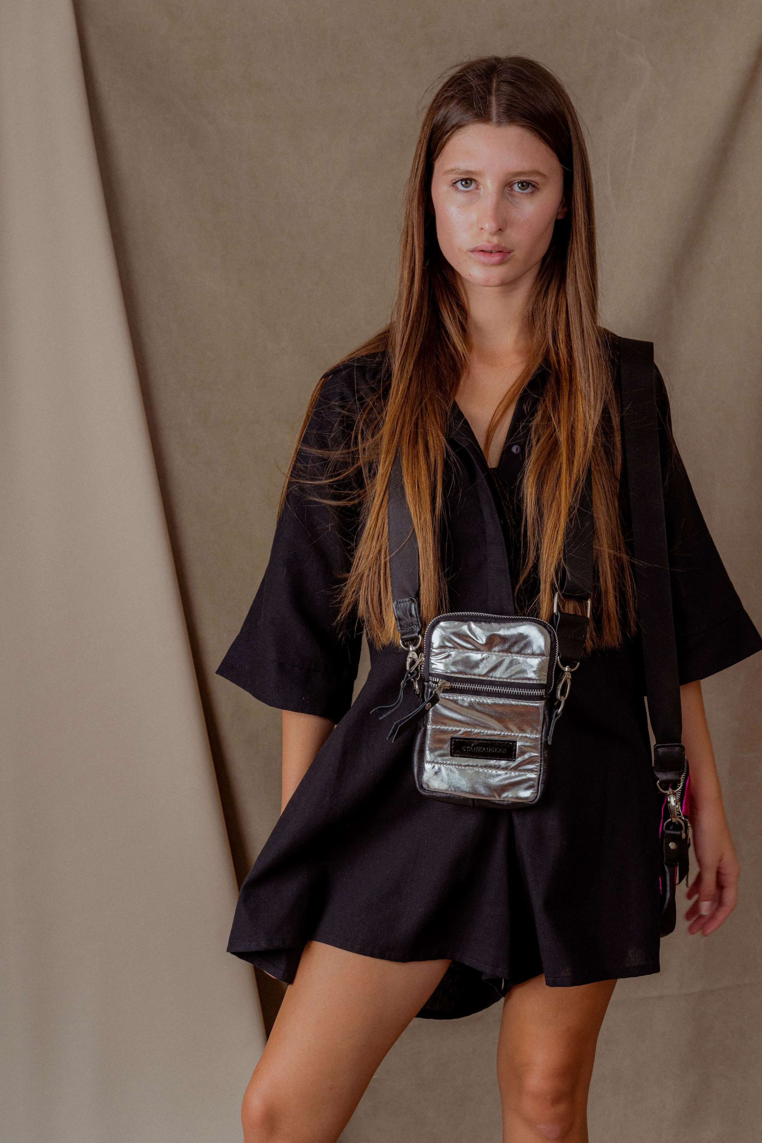 Cartera - Portacelular de tela engomada metalizada, con detalles de cuero negro. Interior forrado, Medidas 13 cm de base x 20 cm de alto x 2 cm de fuelle. Con correa de cinta desmontable y regulable negra.