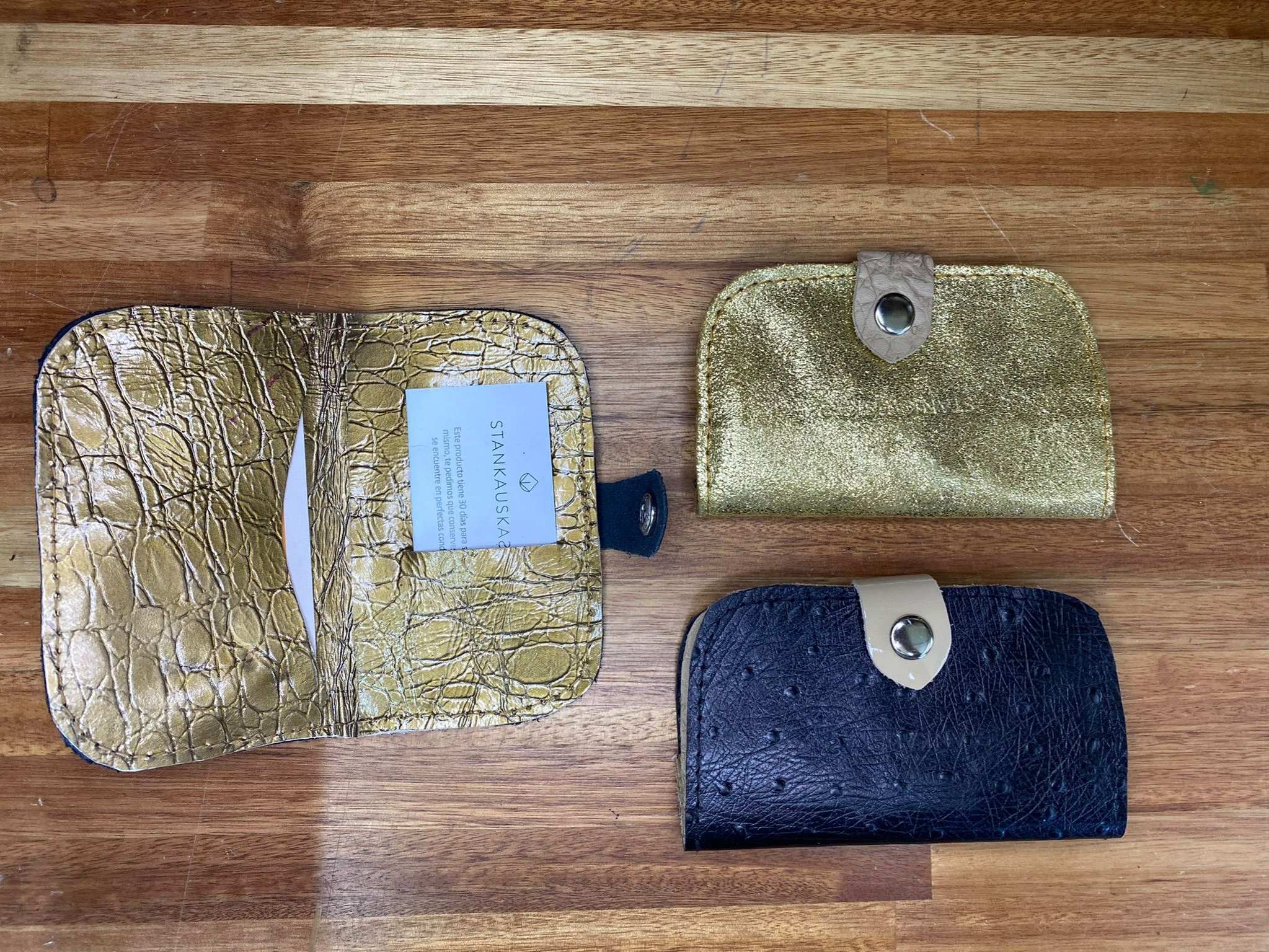Porta documentos de dama, varios colores y texturas. Con espacio para tarjetas de ambos lados. Cierre con broche presión. Medidas 11 cm de alto x 8 cm de ancho.