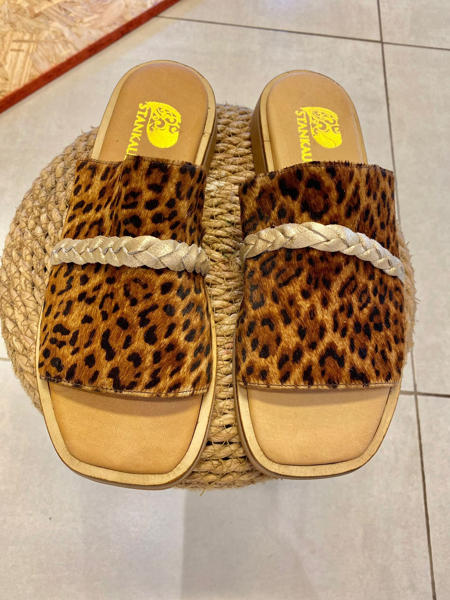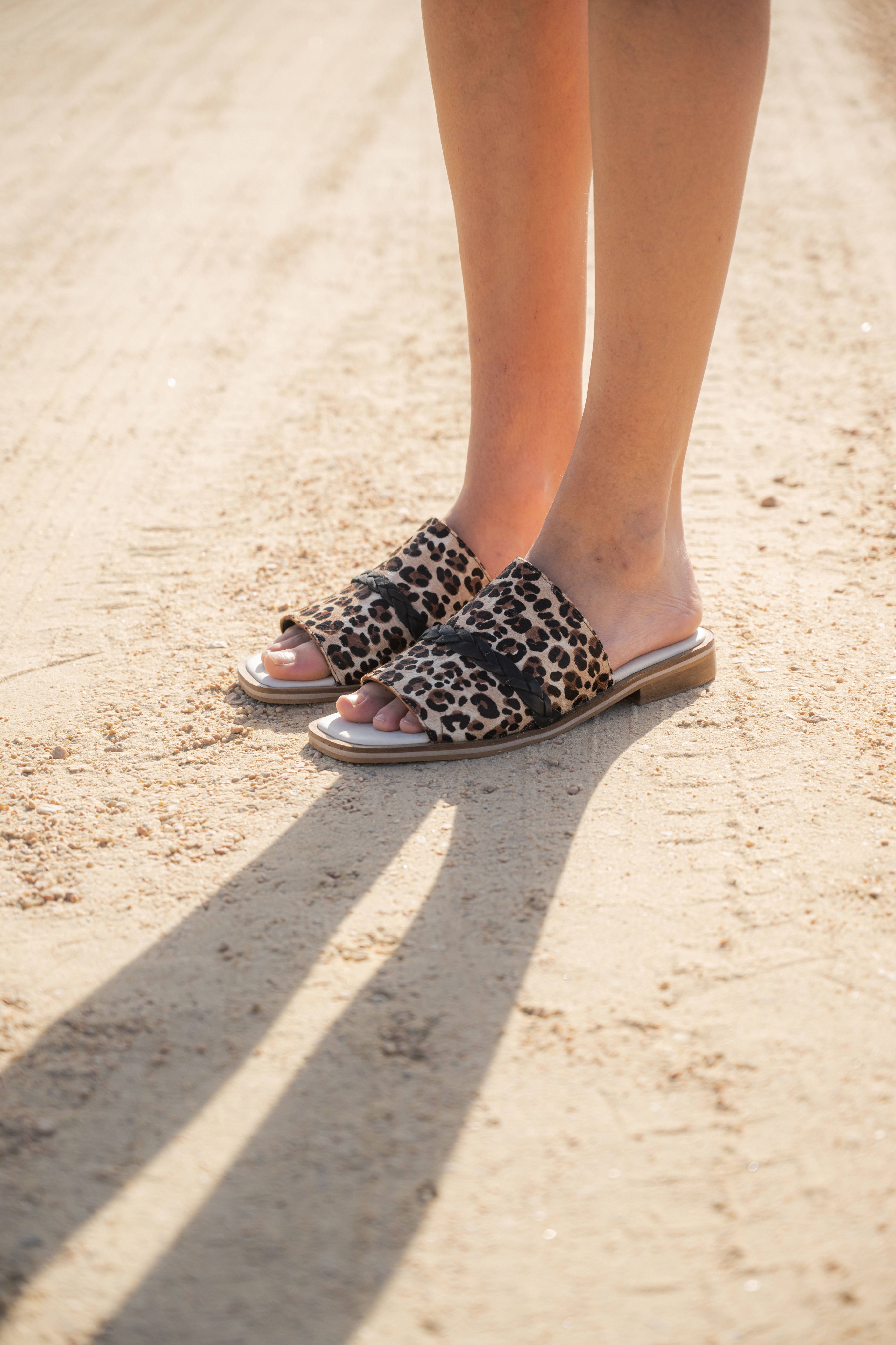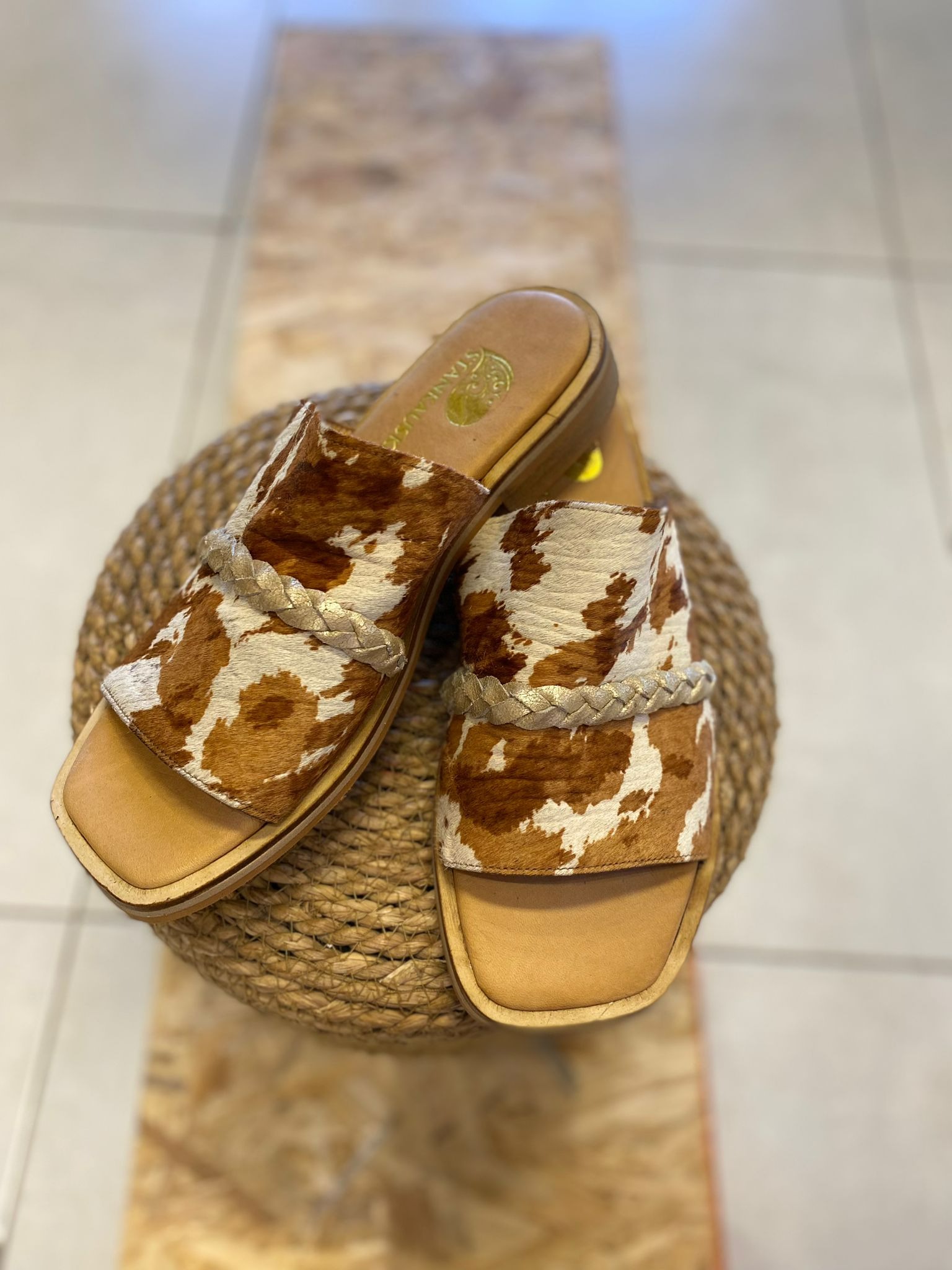 Sandalia de cuero, con capellada de cuero con pelo. Detalle de trenza en la parte superior. Plantilla forrada y acolchonada para máximo confort. Suela antideslizante, con taco de 1.5 cm
