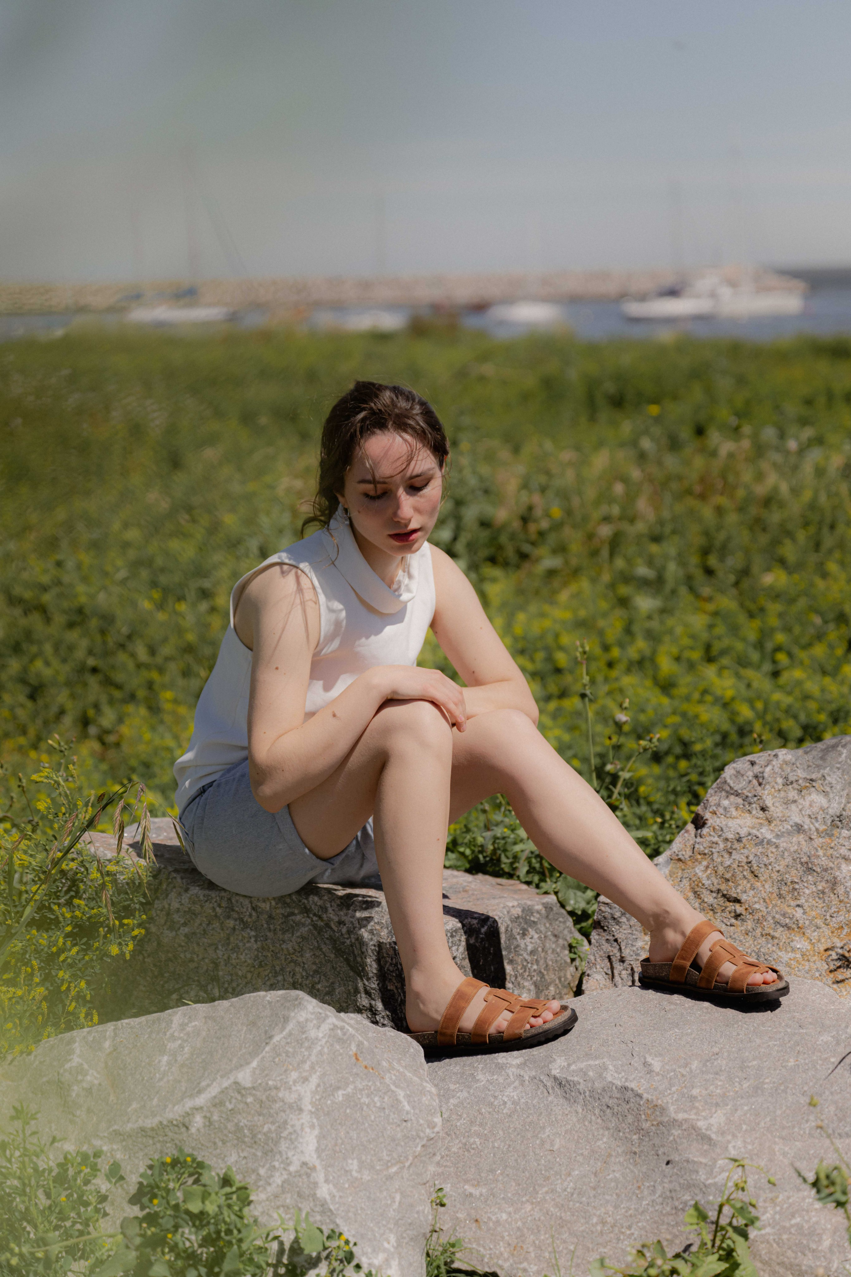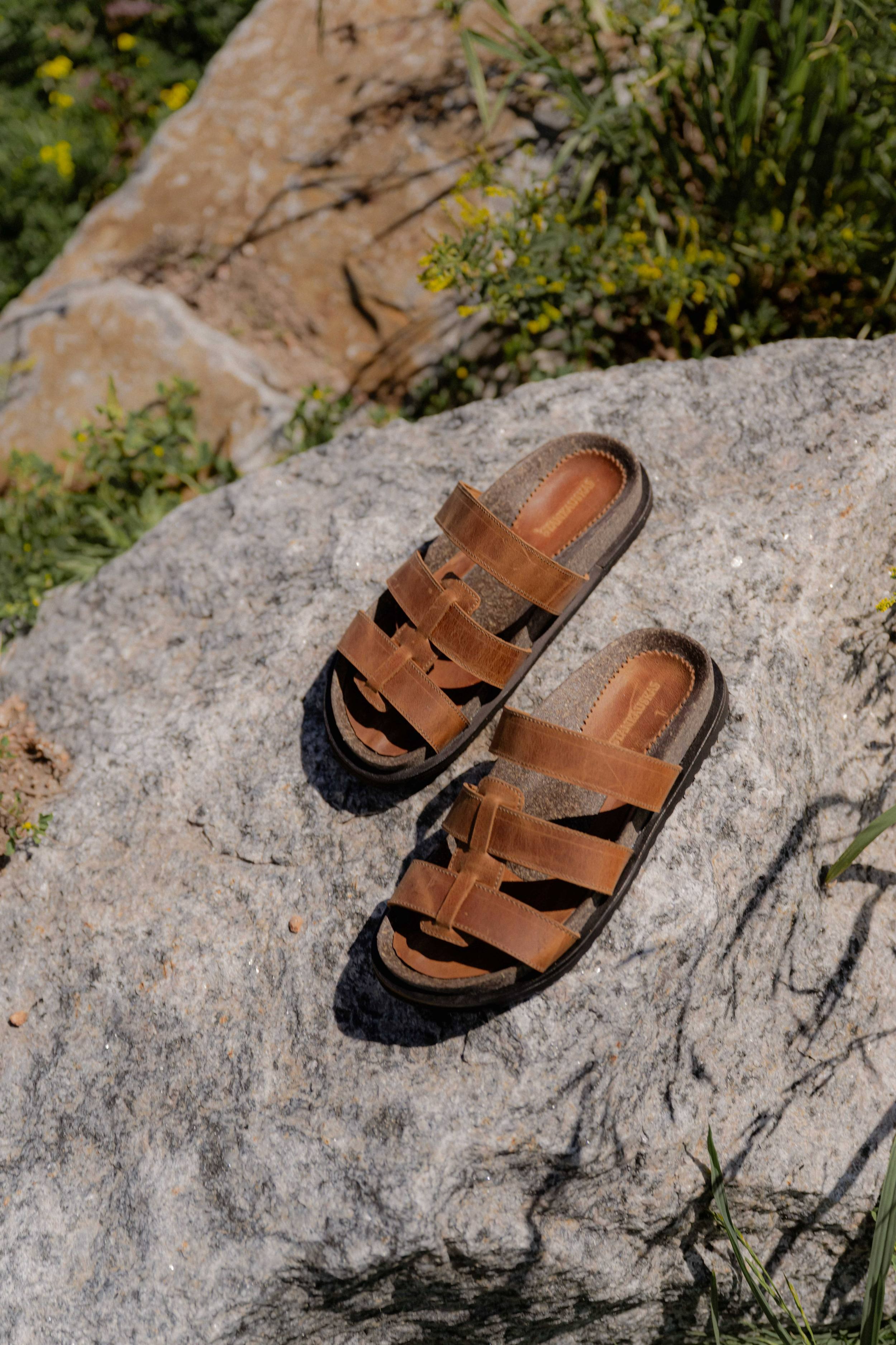 Sandalia anatómica de cuero. Con suela de goma antideslizante y plantilla forrada de cuero.