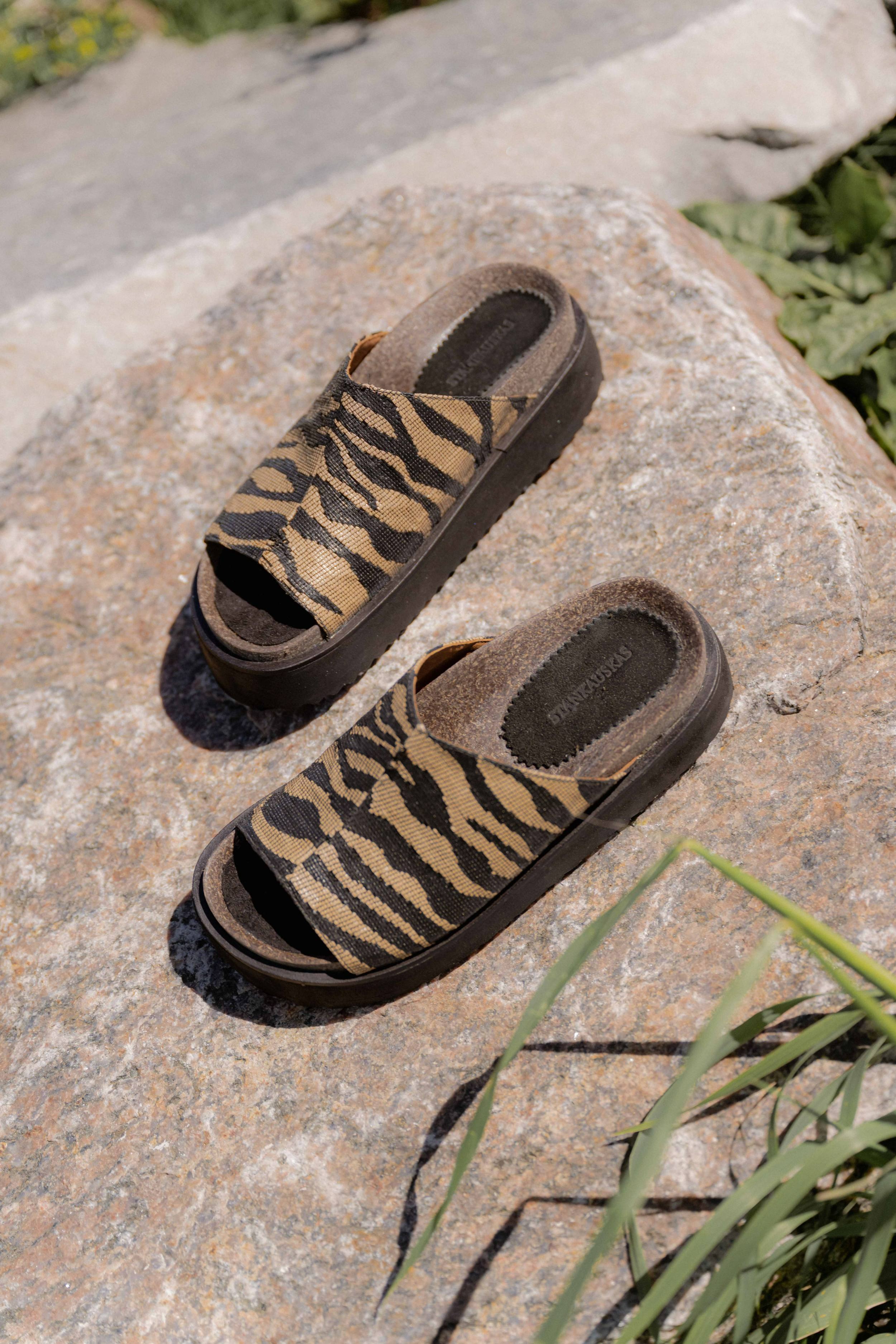 Sandalia con capellada de rafia forrada de cuero. Plantilla anatómica forrada de cuero antitranspirante. Plataforma de goma liviana antideslizante.