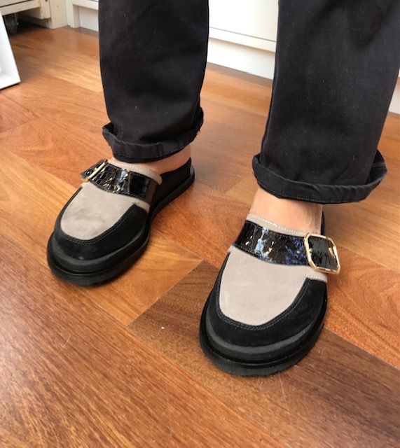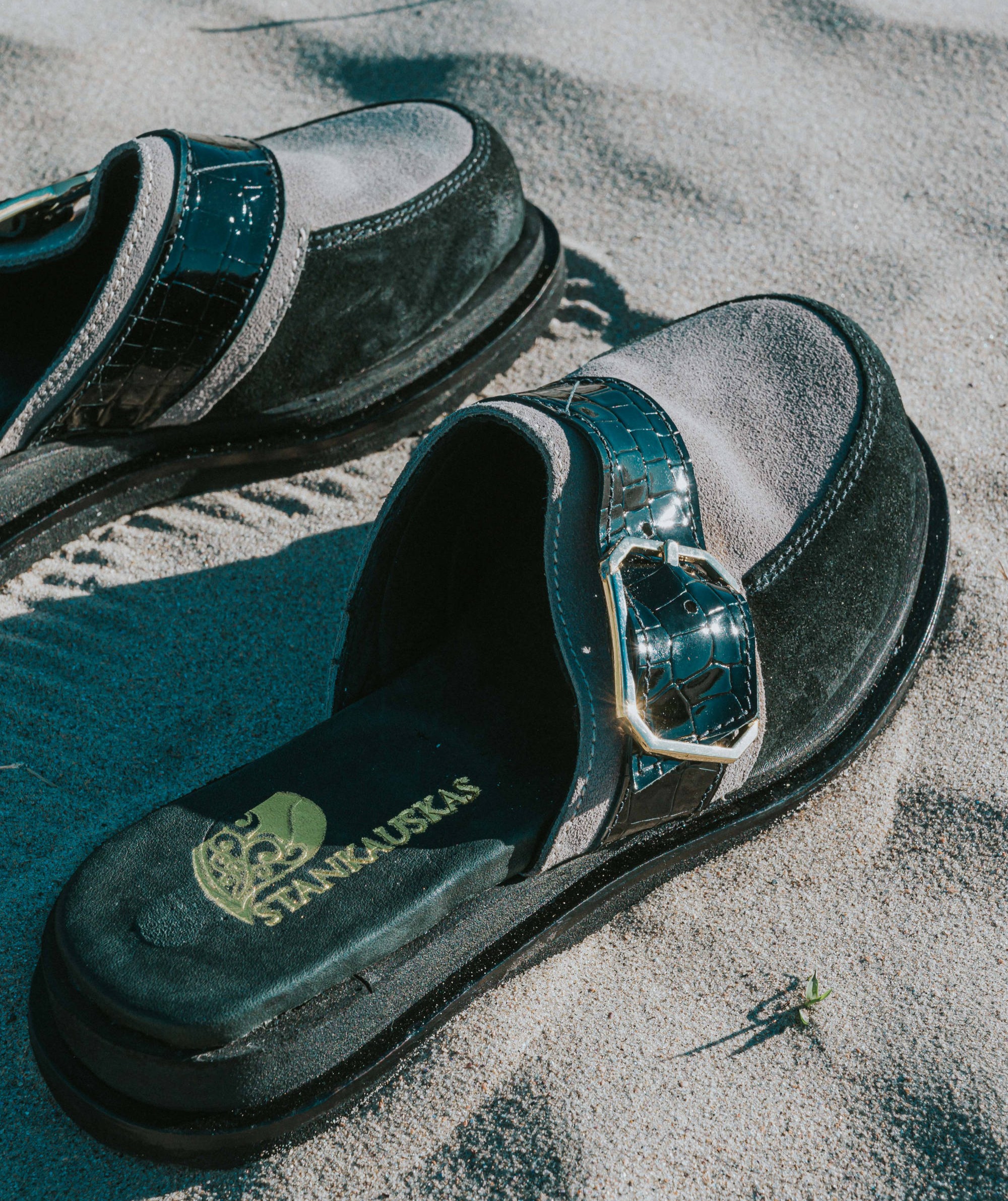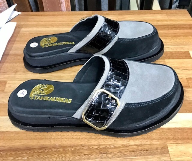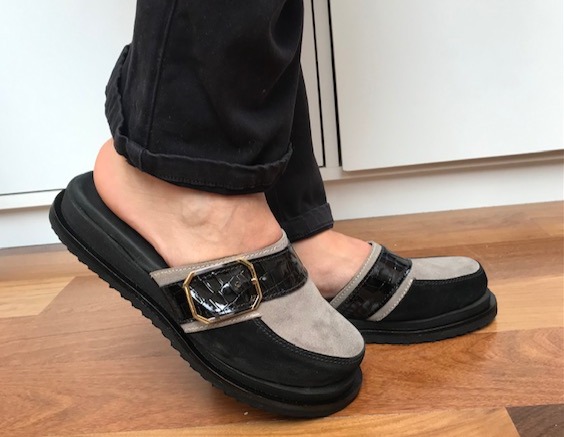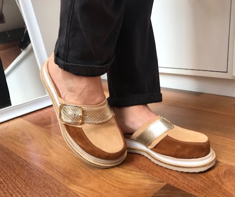 Sueco combinado con hebilla dorada. Plantilla anatomica, forrada de cuero, antitranspirante. Suela de goma antideslizante. Taco 3 cm de alto.