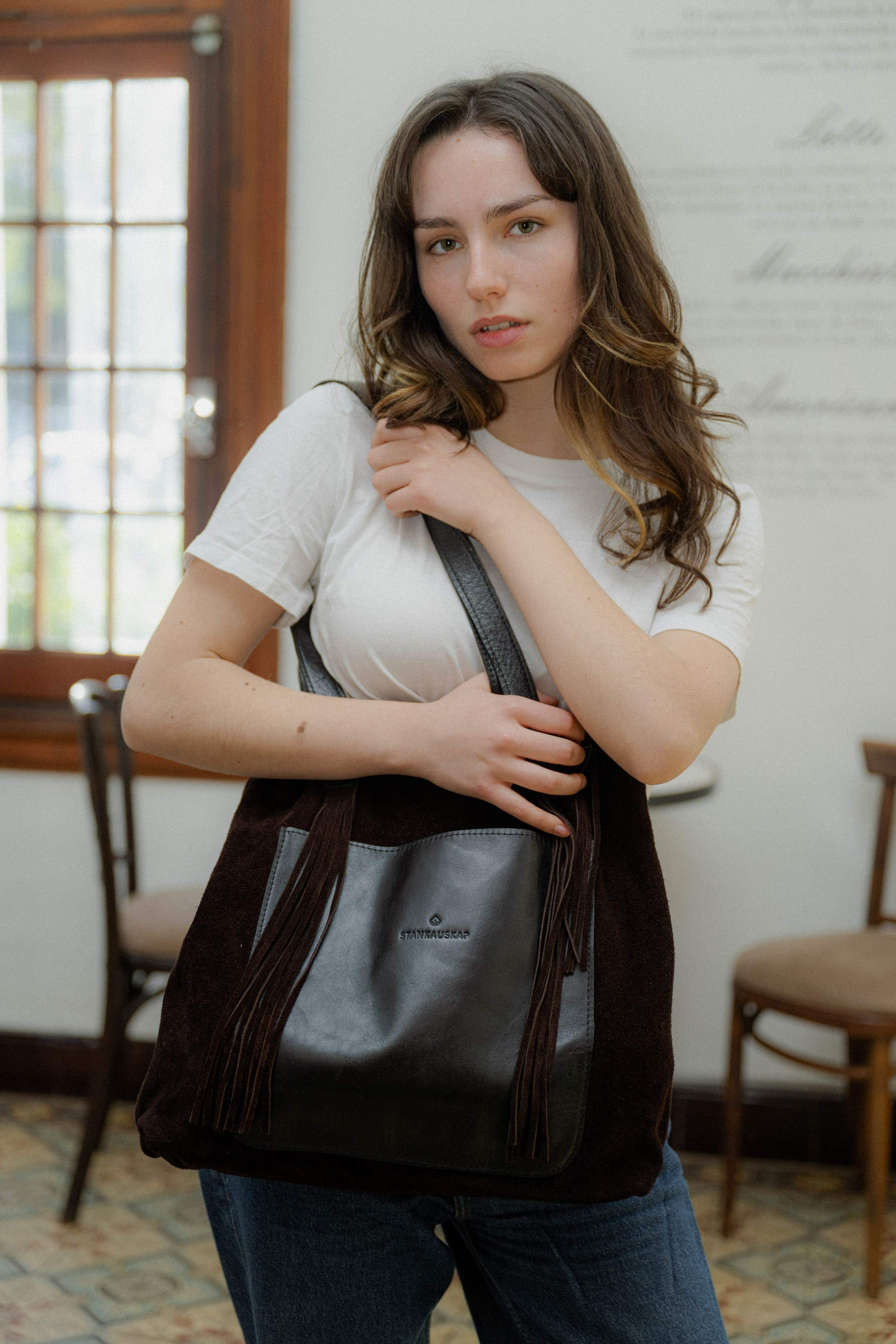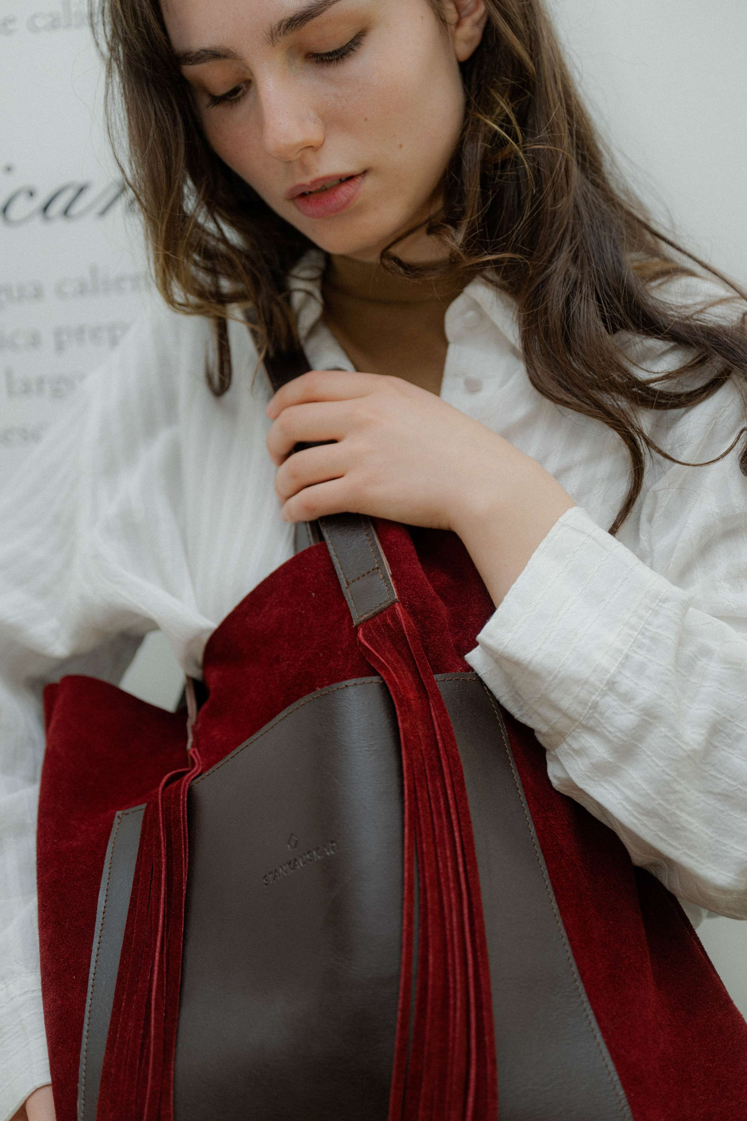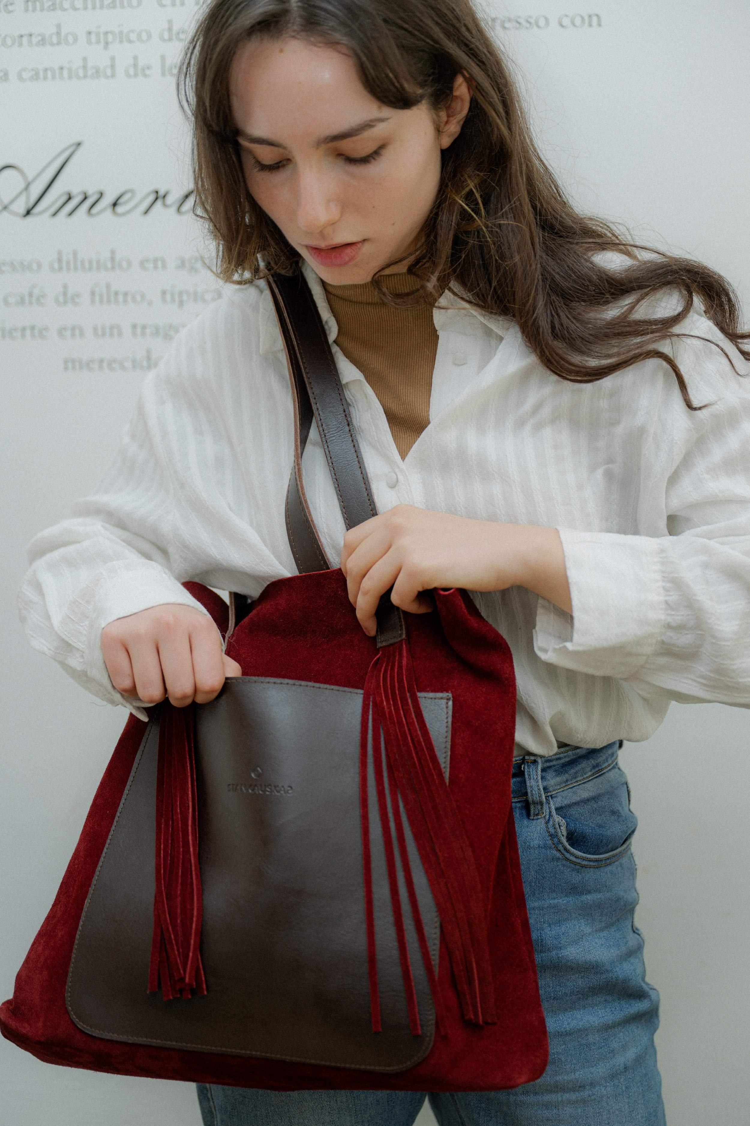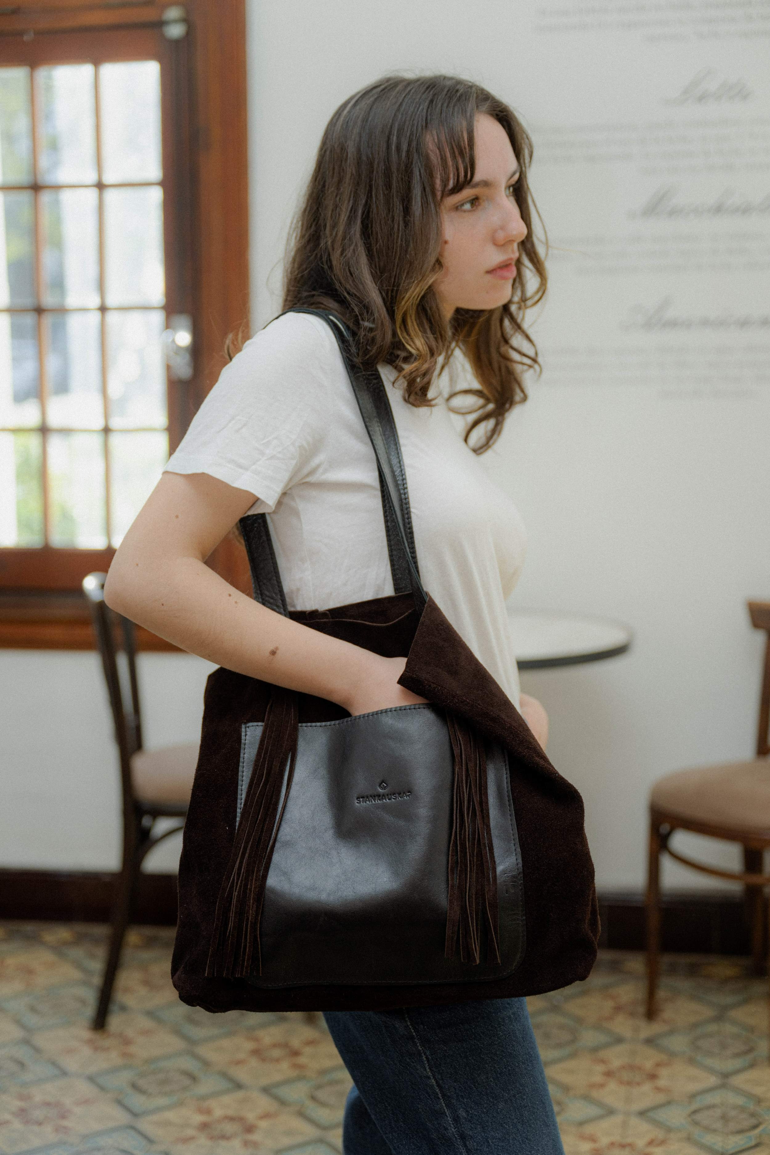 Cartera de gamuza, con bolsillo y asas de cuero. Con detalle de flecos en el frente. Sin forro y sin cierre. Super liviana para llevar todo los que necesites, cuadernolas, notebook, compras, etc. Tiene amplio bolsillo interior. Medidas: 36 cm de base x 40 cm de alto x 10 cm de fuelle.